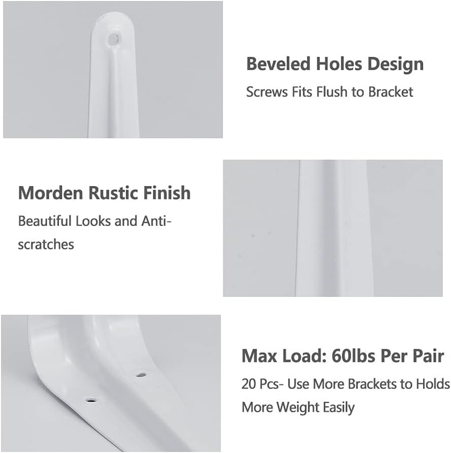 ✔️【Holds Extra Weight 】Pack of 20 shelf brackets so that you can add extra brackets to holds extra weight simply. These heavy responsibility metallic shelf brackets can maintain as much as 60 lbs per pair (2 Pcs).