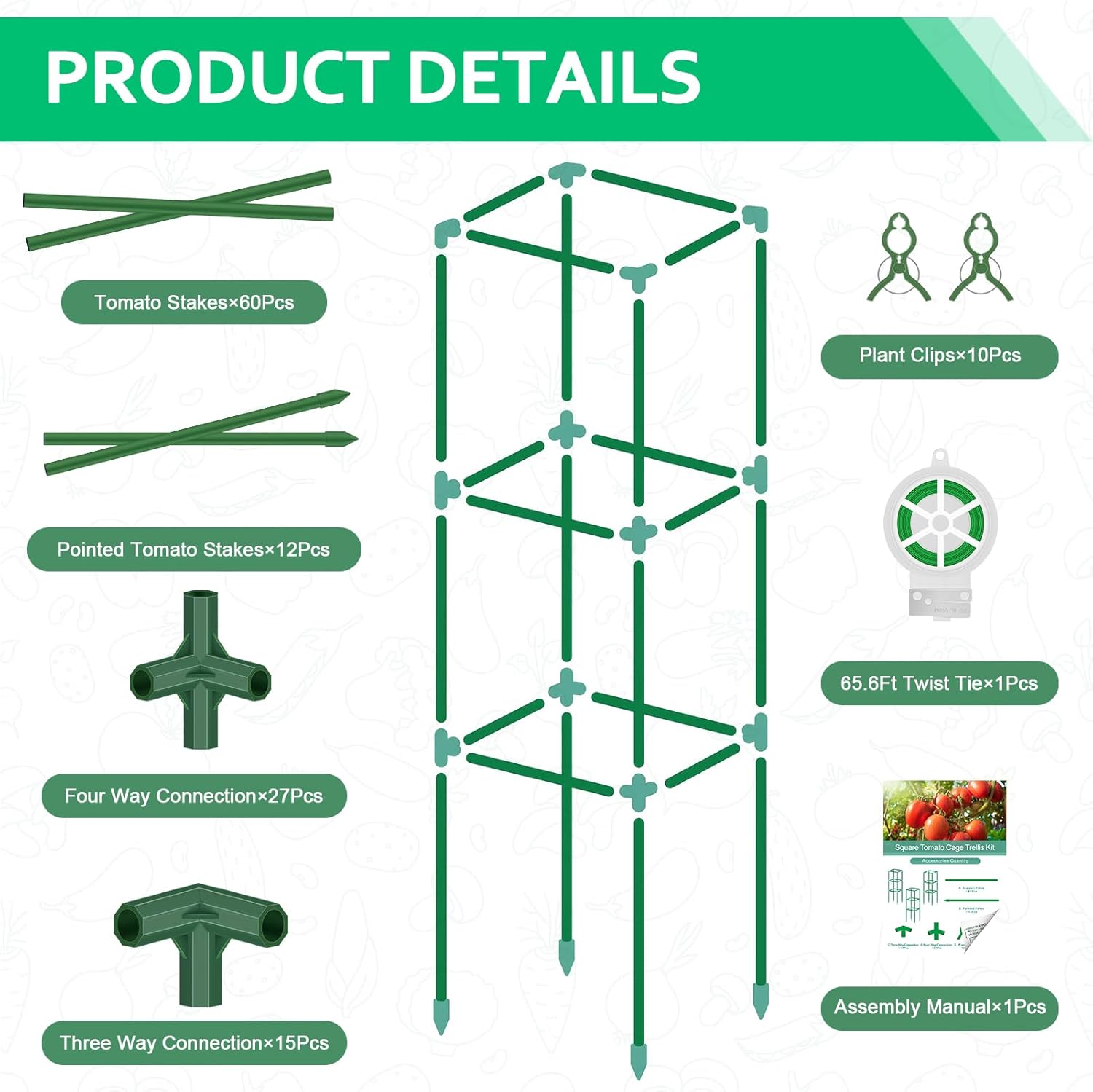 DETAIL: The tomato trellis measures 17x17x50 in and weighs 6 kilos. Package deal contains: 3 pcs sq. plant assist cages, every standing at about 50” in top; 10pcs clamps to bolster plant progress;1roll 65.6 ft twist tie for managing plant progress route and 1 meeting handbook