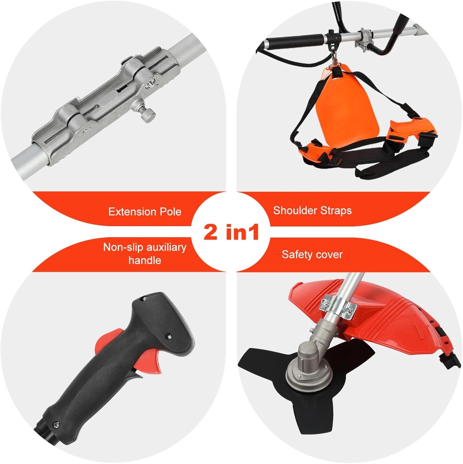 【2-IN-1 Fuel Trimmer for Thick Grass and Bush】The gasoline weed wacker blade attachment has a heavy-duty 3 T blade , trimmer line head and lengthy rod, which is good for slicing thick bushes and weeds. Ultimate for yards and lawns from checking out your grassy edges with the weed trimmer, to trimming bushes and roots with the garden edger garden software.