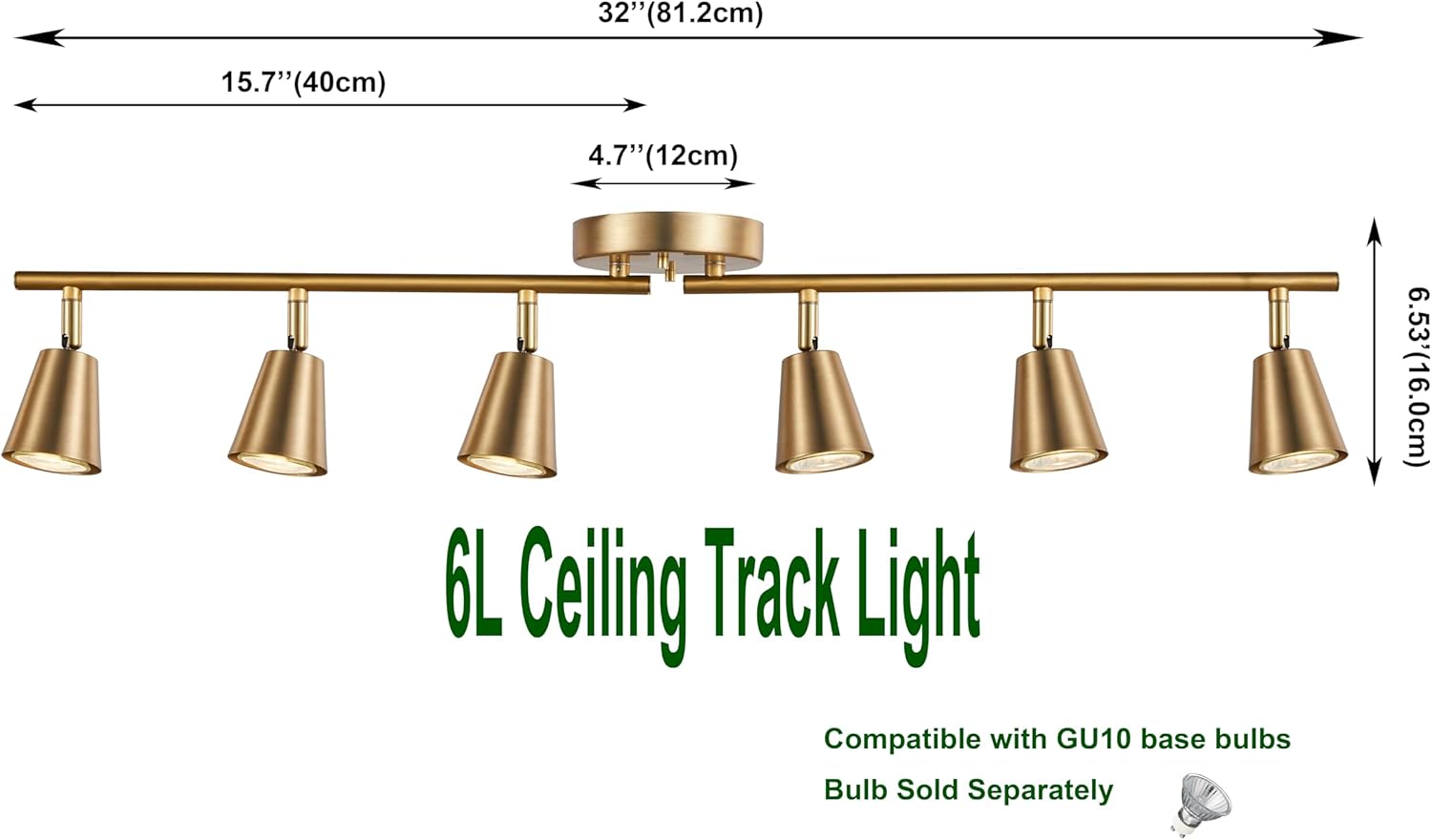 Enter Voltage: 120V Wattage: 6xGU10 Max.50W Bulbs(bought individually) Base: Requires 6xGU10 Base Max.50W or LED gentle bulb (bought individually) Shade: Matte Brass Materials: Steel Dimension: L32xW4.7xH6.53inches