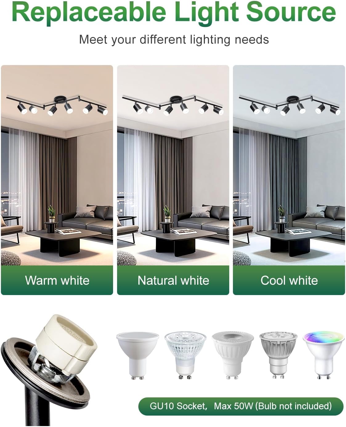 GU10 Socket: This observe lights ceiling adopts GU10 socket (excluding bulbs), which is appropriate for many GU10 bulbs. The utmost wattage of the bulb doesn’t exceed 50W. You possibly can select the kind of GU10 bulb to satisfy totally different wants