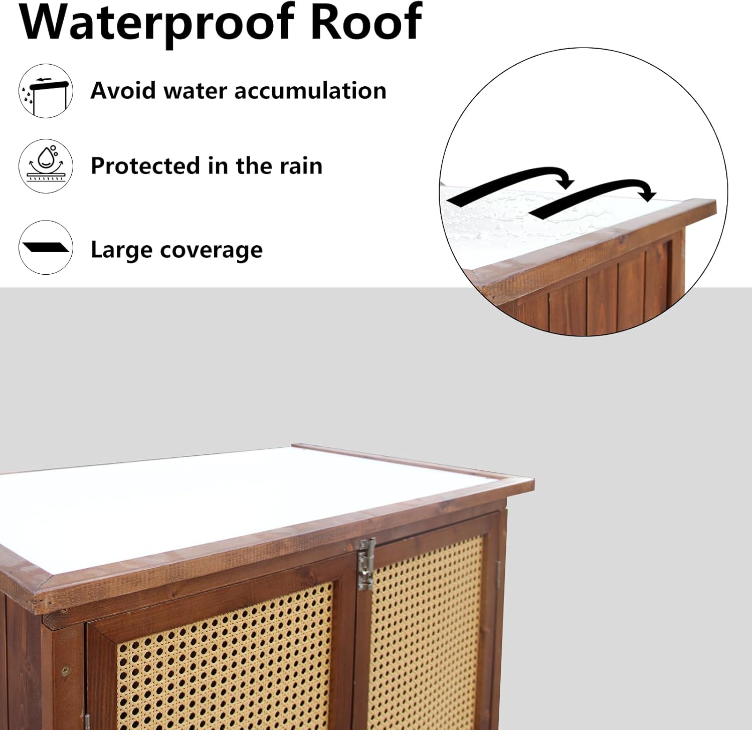 Wooden and Rattan: The outside storage cupboard is crafted with strong wooden and woven rattan door panels, this software shed combines rustic sturdiness with elegant aesthetics; The sanded floor and protecting coating ensurs long-lasting outside and indoor use