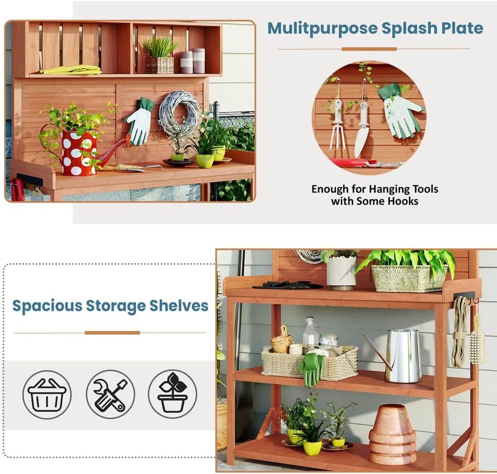 Splash Plate& Aspect Hook There are at all times many small kits when gardening reminiscent of hand trowels, rakes, transplanters, towels, gloves and, in fact, your farmer’s hats. Simply with some nails, the splash plate will turn into a board to carry your instruments. Apart from, the potting desk comes with 3 hooks within the facet which is able to make gardening simpler.