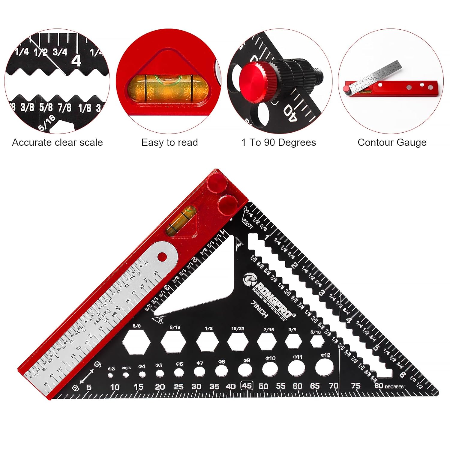 🔥【8-in-1 Rafter Sq.】🔥It combines eight woodworking instrument capabilities in a single, together with Sq., Protractor, Ruler, Depth Measurement, Marking Gauge, T-Bevel Gauge and Degree, wrench. Your new all-purpose precision instrument.