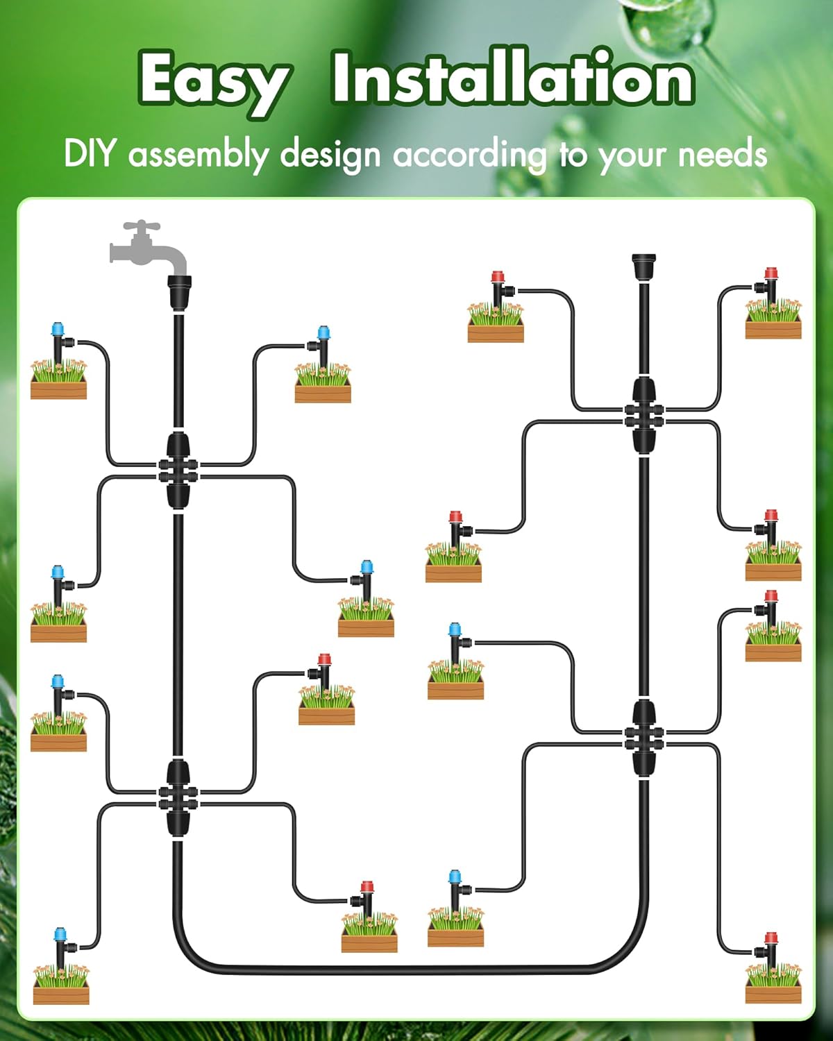 With a wide range of equipment to satisfy all of your backyard watering wants. Together with 79FT 1/4 inch irrigation pipe, 16.5FT 1/2 inch irrigation pipe,, it could improve water strain, has 6-way connector, use 1/2 inch drip irrigation pipe as the principle line. Use 1/4 inch pipe department and join dripper