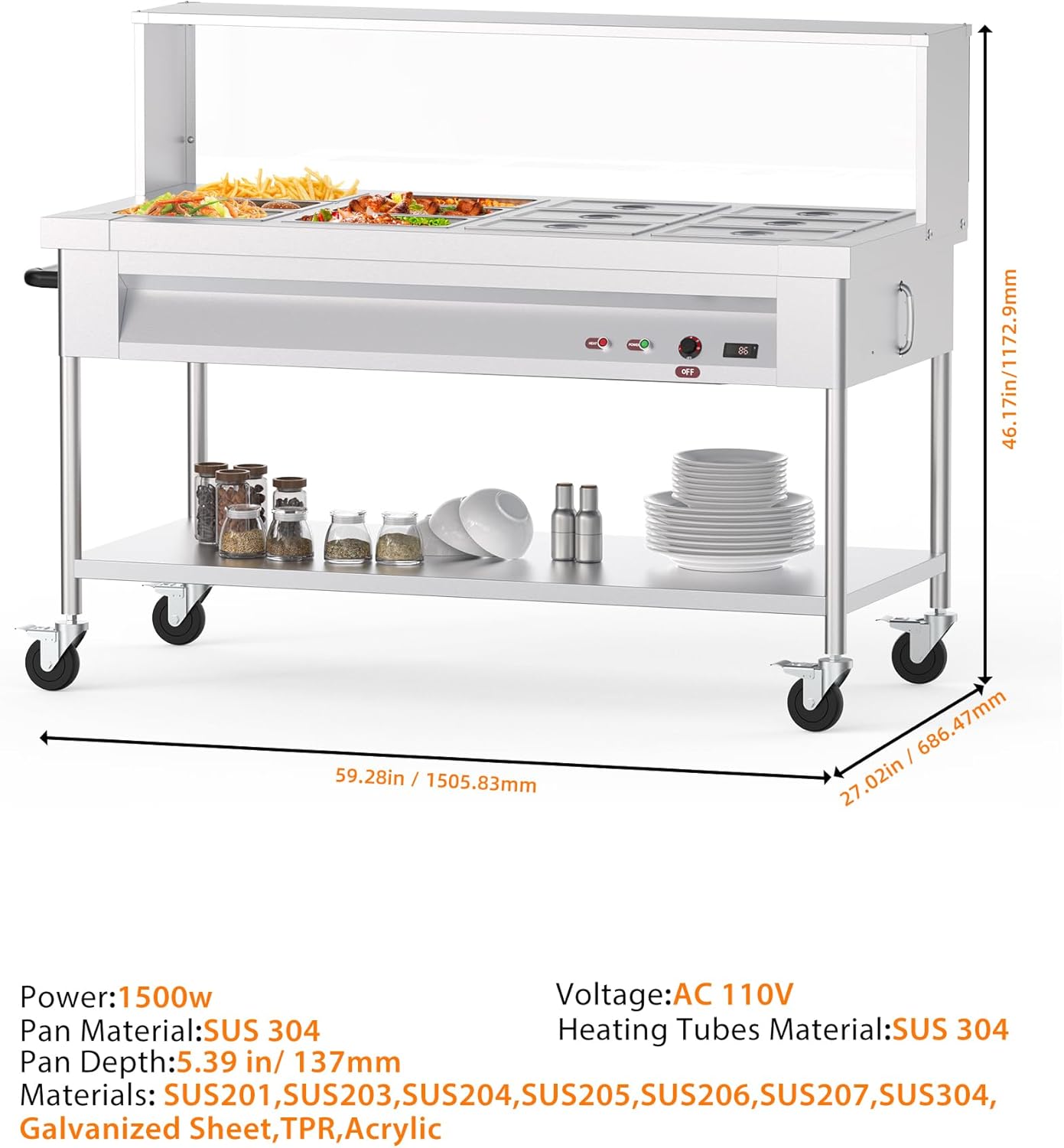 【Package deal & Measurement】The general dimensions of this product are 58.3″ x 26.5″ x 33.5″, and it comes with 12 pcs meals pans measuring 12.8″x6.9″x5.9″, every with a capability of 8qt. Moreover, it features a water pipe to your comfort.