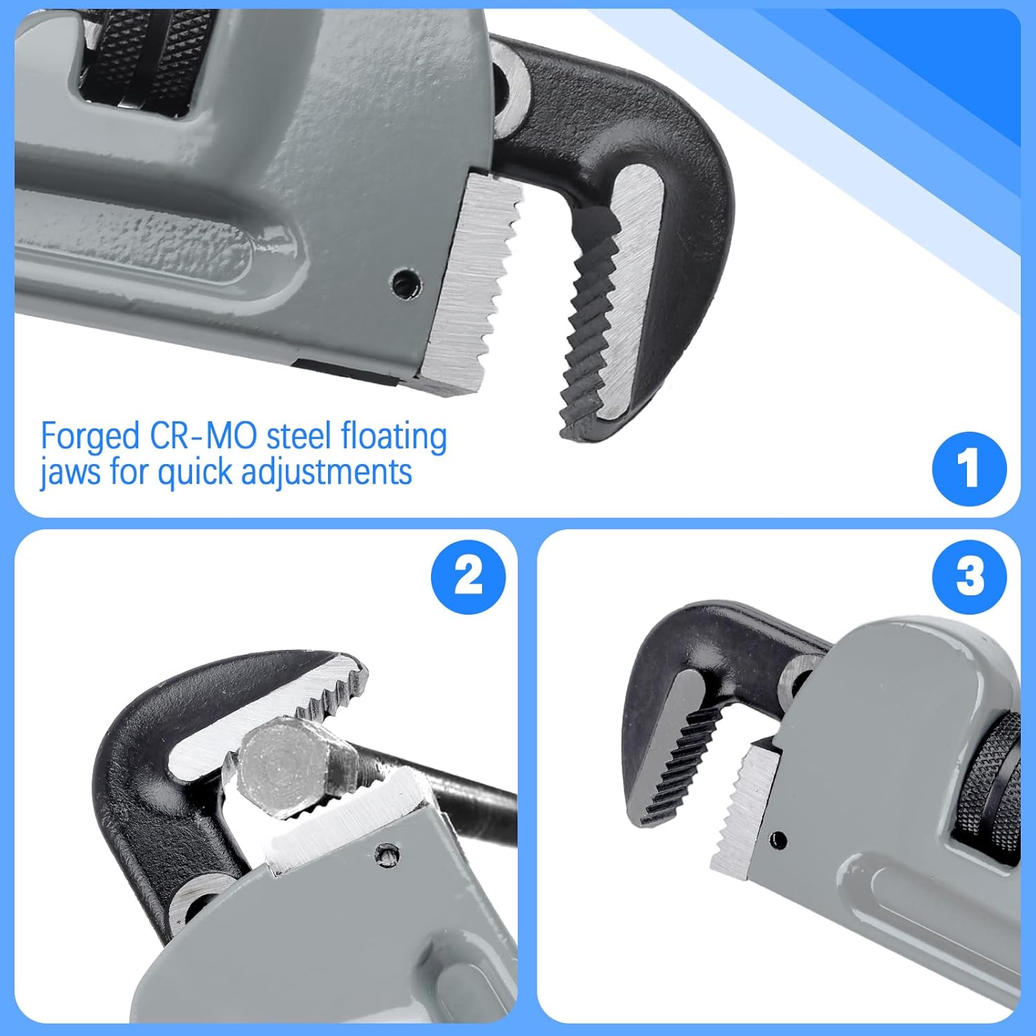 Warmth-treated jaws present glorious resistance towards deformation and breakage, delivering long-lasting efficiency even underneath heavy hundreds. The floating jaws are geared up with a quick-adjust mechanism, enabling seamless adaptation to numerous pipe diameters. With a 10-inch wrench that expands as much as 1-1/2 inches, a 14-inch one reaching 2-1/2 inches, and an 18-inch one extending to 3-3/4 inches, this set is ideal for a variety of plumbing initiatives, from small pipes to massive industrial fittings.
