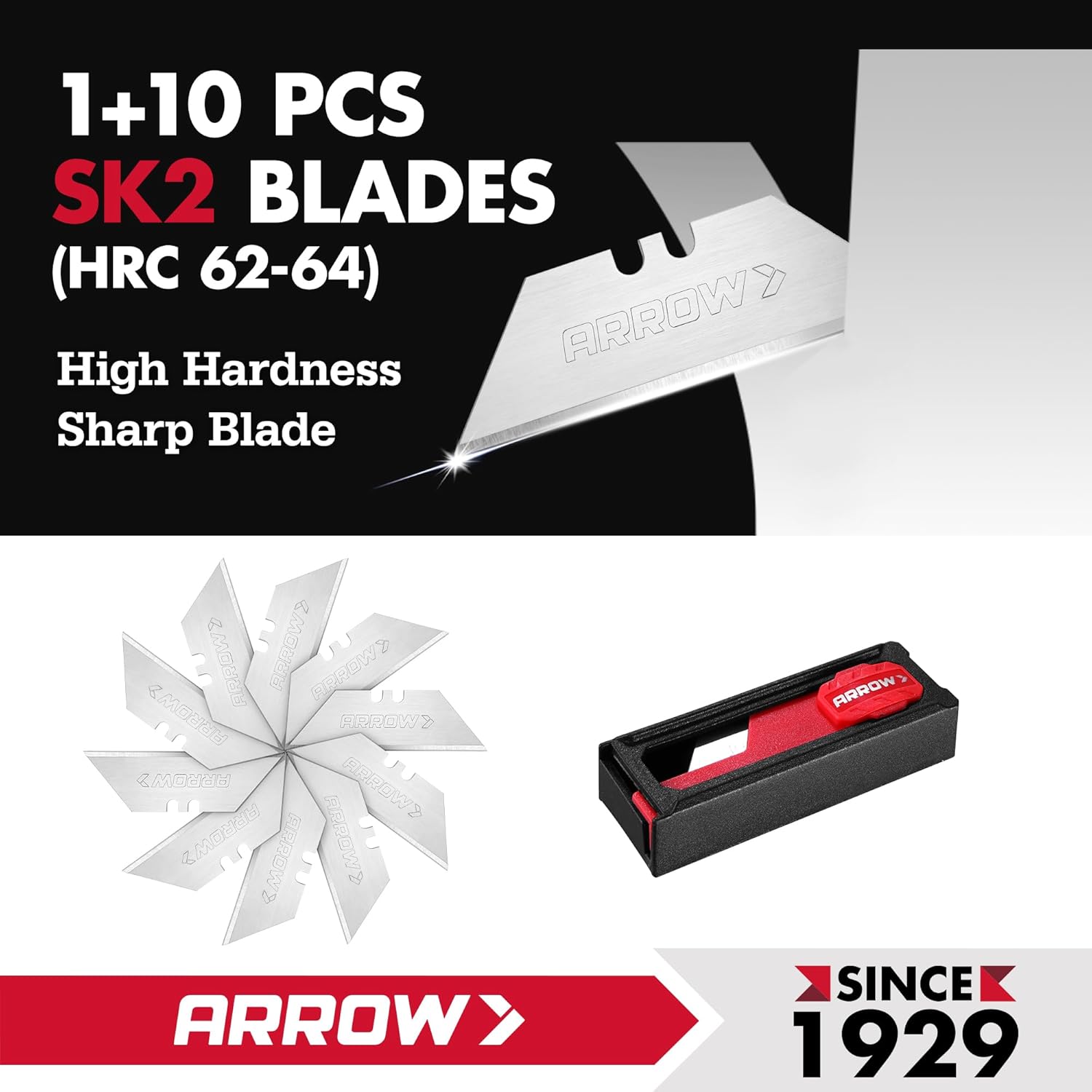 ARROW Folding Utility Knife, Quick-Change Box Cutter with Belt Clip, Liner Lock, Heavy Duty Aluminum Razor Knife with Comfortable Handle, 10 Extra SK2 Blades Included