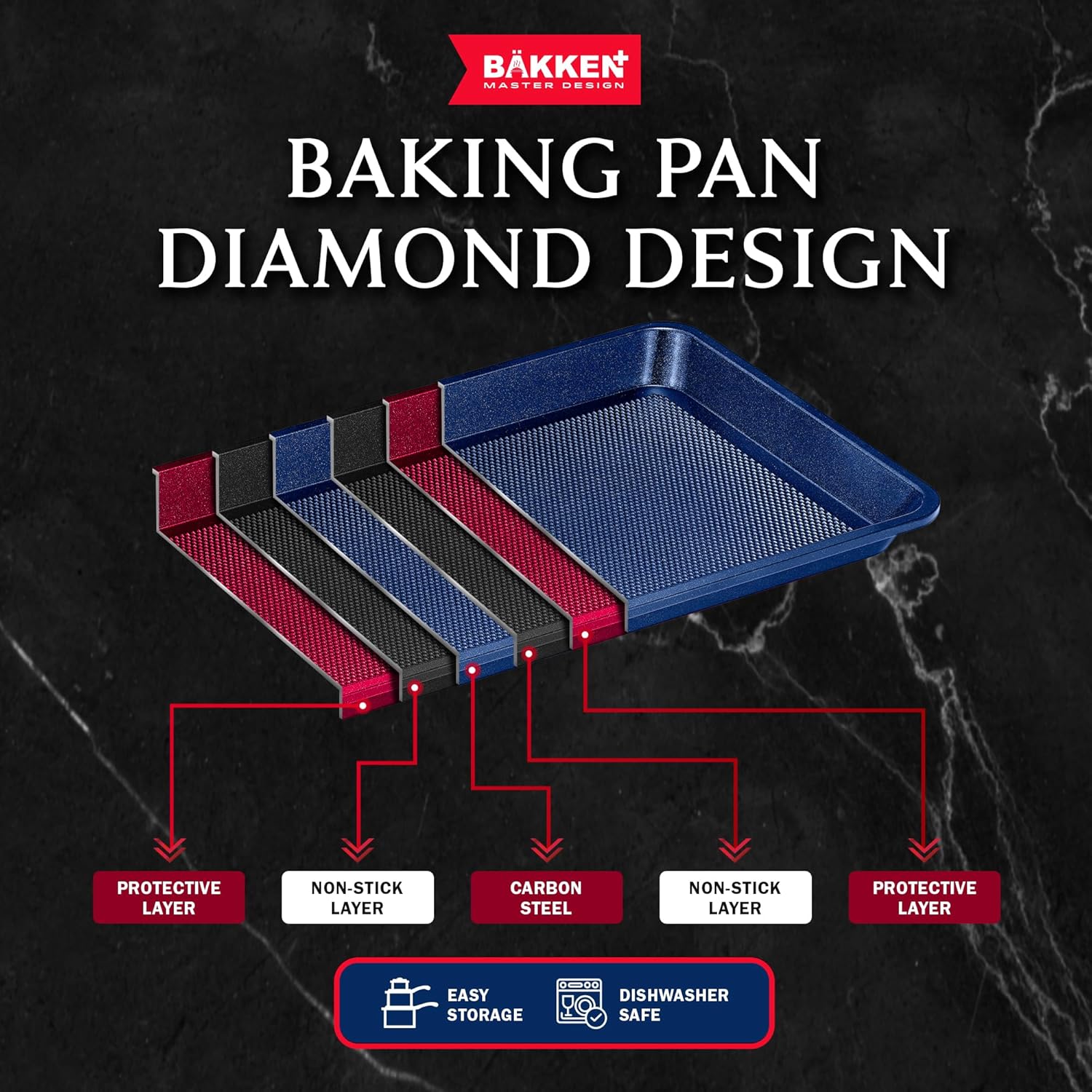 BAKKEN Kitchen Baking Pan – Small, Medium, and Large Cookie Sheet (13.58×9.65, 15.75×11, 17.91×12.60), Nonstick, Diamond Texture Bottom, PFOA, PFOS, PTFE Free, Oven Safe Tray (450°F), Pack of 3, Blue
