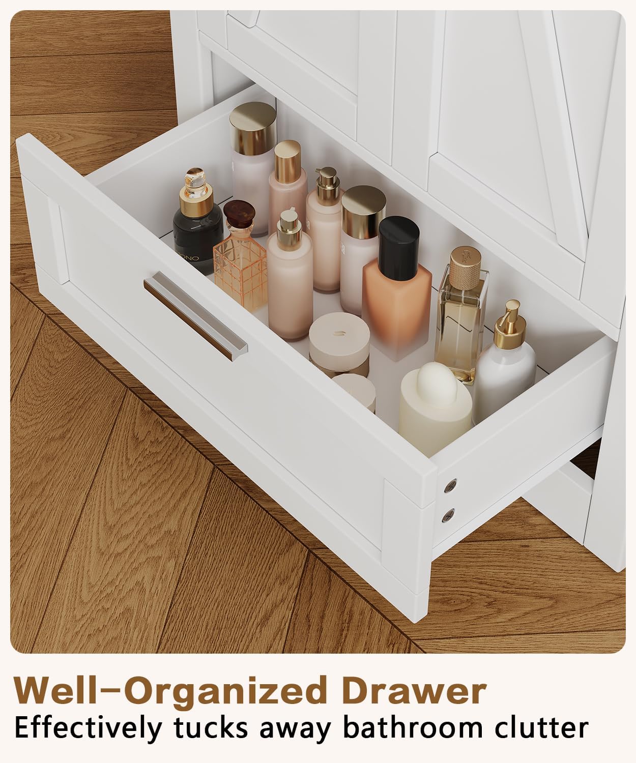 Charming Barn Door Aesthetic: Elevate your toilet decor with our fashionable barn door toilet ground cupboard. The barn door provides a contact of rustic class, making it a standout piece in any toilet