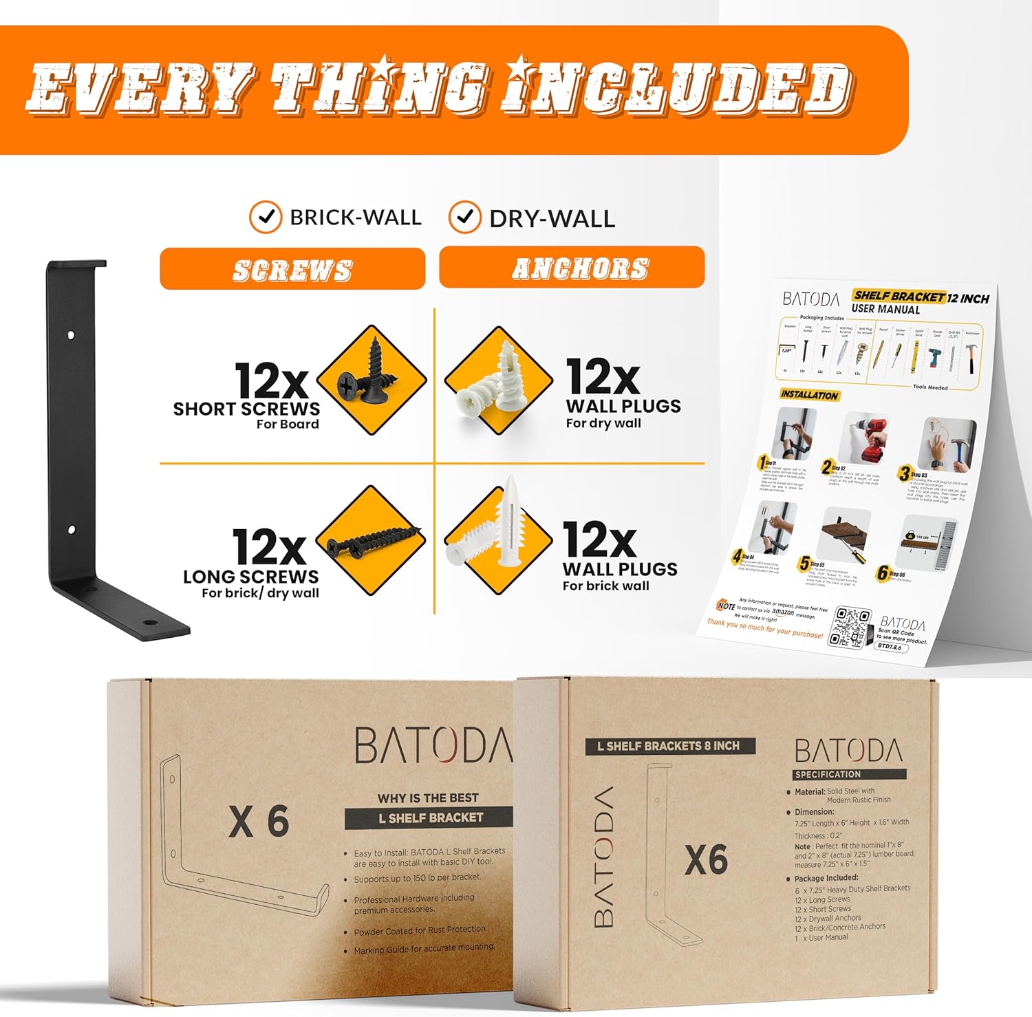 Every thing Included 6 x 11.25″ heavy responsibility shelf brackets 12 x Brief Screws 12 x Lengthy Screws 12 x Drywall Anchors 12 x Brick/Concrete Anchors 1 x Consumer handbook
