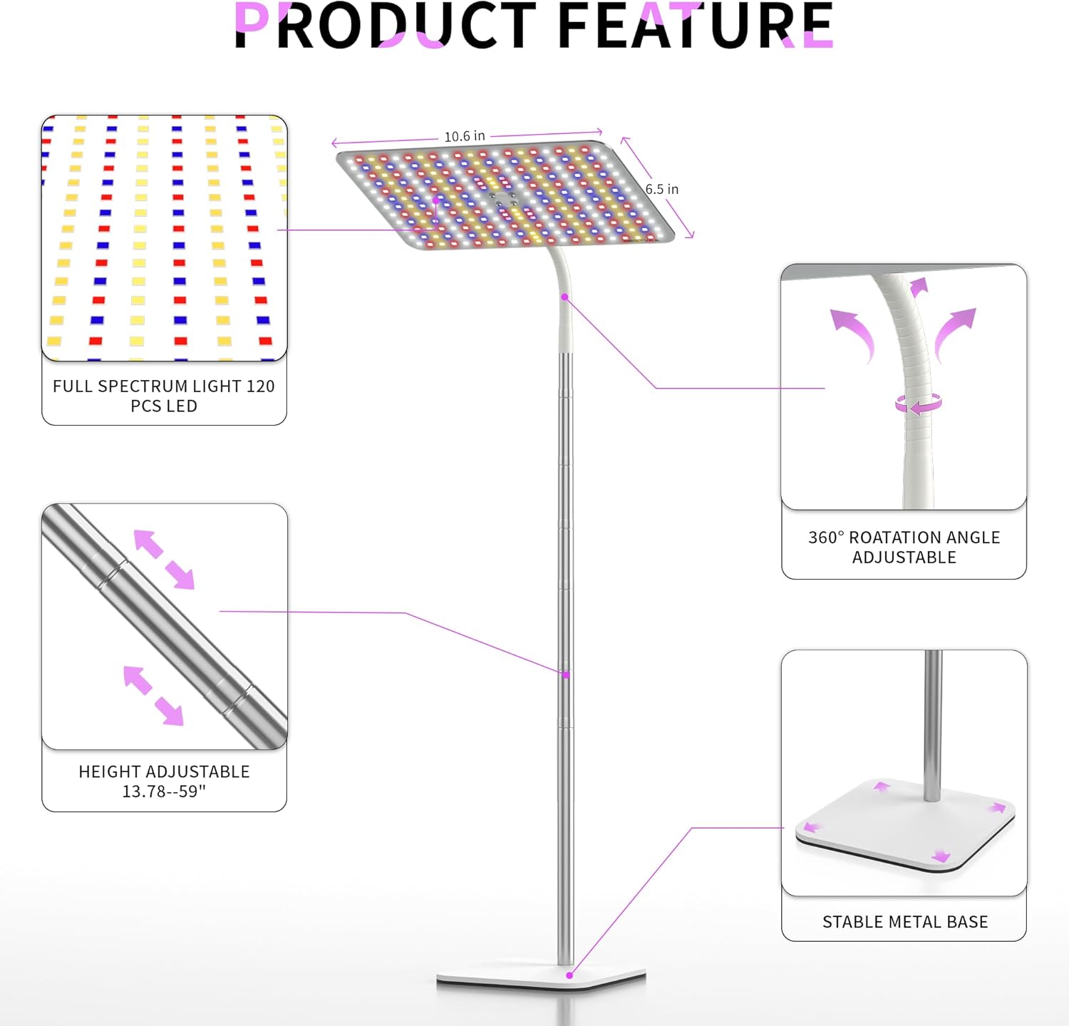 Ground Develop Gentle with Adjustable Stand:This develop mild lamp with a steady steel base that lets you place it on the ground or tabletop and regulate the pinnacle top from 12“ to 59” relying in your utility. The versatile gooseneck can rotate 360 levels, permitting you to simply regulate the peak and angle you might want to fit your crops!