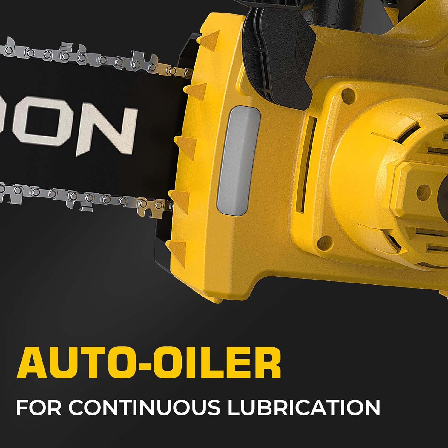 BITOON 20V POWER SYSTEM: The chainsaw is supplied with a BITOON high-performance 4.0Ah battery, which might full as much as 60 cuts(4×4 in.) per cost. Low-voltage safety is our first concern. The machine will robotically shut down if the battery voltage is under 15v to forestall any overload injury. The battery and charger are included and can be utilized out of the field.