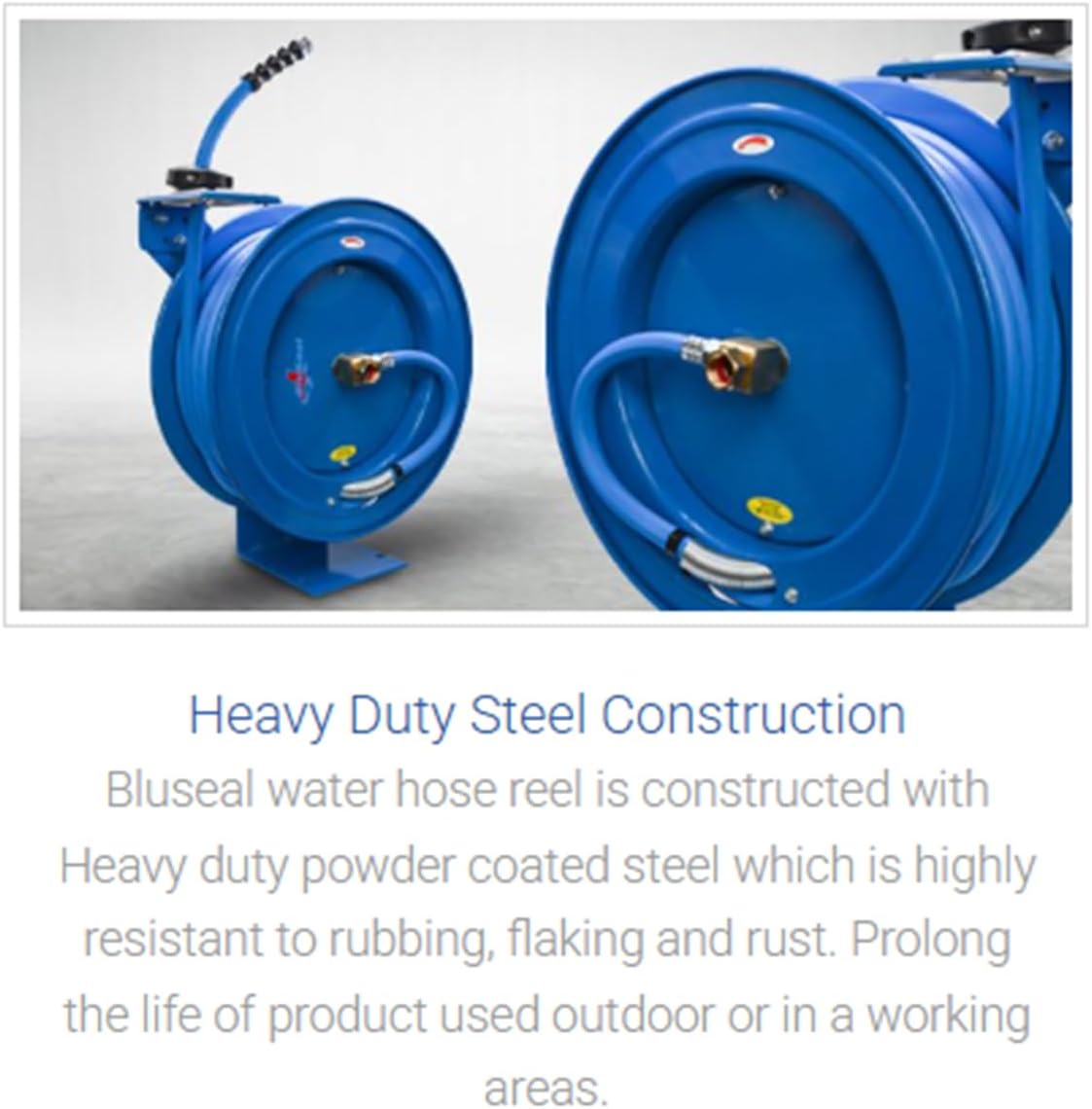 NEVER COIL YOUR WATER HOSE AGAIN: BluSeal’s hose reel comes with a completely retractable, 50 ft, 5/8 inch 500 most PSI hose. Our heavy-duty brass fittings assign the product the absolute best options available in the market.