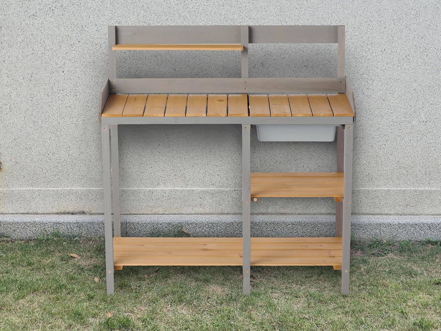 Remodel your outside gardening area with this versatile potting bench that mixes type and performance. The sturdy workstation encompasses a spacious prime floor good for potting crops, organizing instruments, and dealing with backyard provides. Its gray-finished body paired with pure wooden surfaces creates a contemporary aesthetic that enhances any outside setting. A number of storage cabinets present ample area for maintaining soil luggage, pots, and gardening necessities neatly organized and simply accessible. The thoughtfully designed workbench features a raised again panel that helps comprise soil and particles whereas working. Constructed to resist outside situations, this potting bench serves as each a sensible workspace and a gorgeous addition to your yard or backyard space. The mix of open and enclosed storage areas ensures all of your gardening provides keep organized and inside attain.