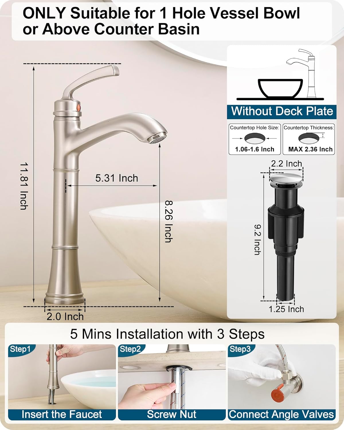 No Stress & No Plumber: Putting in vainness faucet 1 gap tall is fast, taking solely 5 minutes. All the required instruments are included, and no plumbing expertise is required. Tall rest room taps for vessel sinks comes with an in depth instruction guide to information you thru every step, making certain a clean and error-free set up. Skip excessive price of hiring a plumber and luxuriate in extra time at residence with your loved ones