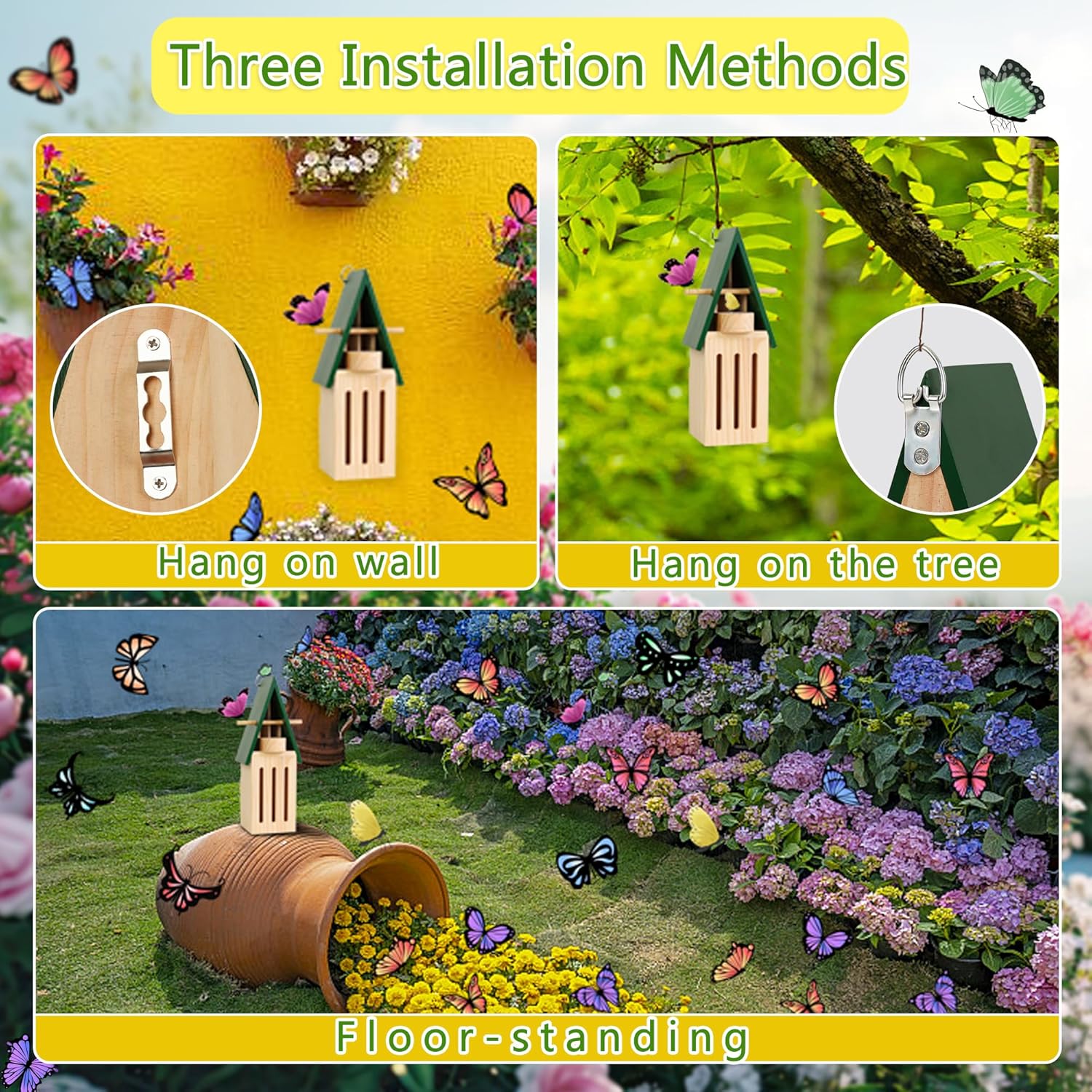 Three Set up Methods: The butterfly shelter for backyard is provided with prime hook and again hook so you possibly can dangle it on a tree or backyard wall; With the flat backside you possibly can place it immediately amongst flowers on the bottom. Discover: Put it to the flowers as shut as doable so as to appeal to butterflies a lot successfully.