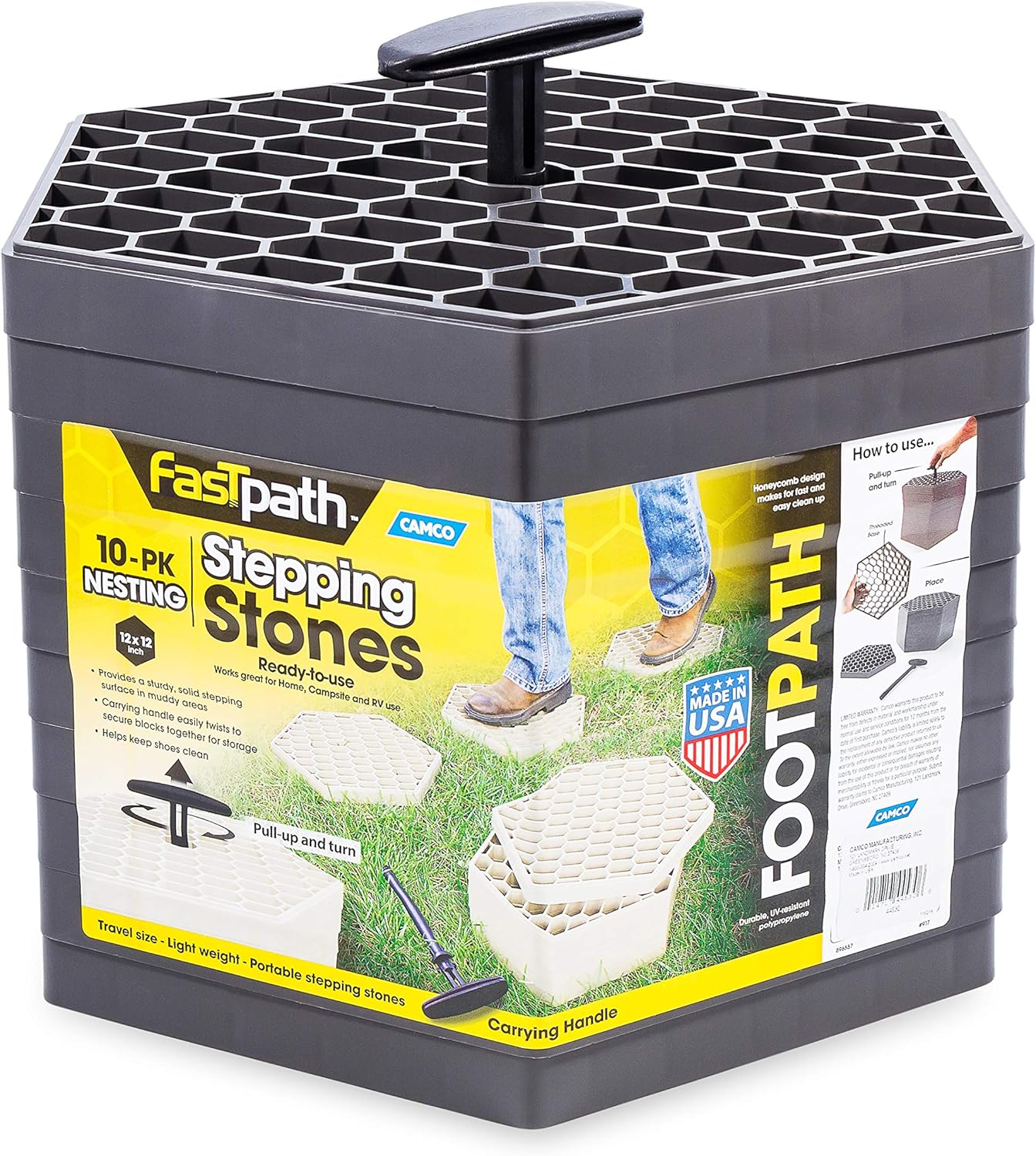The Camco Fasten Footpath stepping blocks are an awesome asset in your campsite, backyard, or within the yard. The FasTen Footpath Stepping Blocks is usually a sturdy, stable stepping stone on the entry to your RV, beside your tenting water supply, in that perpetually muddy nook or a delegated footpath by means of a backyard. They will even be stacked and used as a step stool, or to create ranges amongst your potted crops. The sturdy, UV-resistant polyethylene has a lower out design, making it simple to clean-simply hose off any mud, filth or particles. The set of ten stepping blocks has an built-in FasTen deal with that goes by means of the middle of the stacked pads when they’re all nested and twists into the threaded backside pad to carry the set collectively, then telescopes down for compact storage.