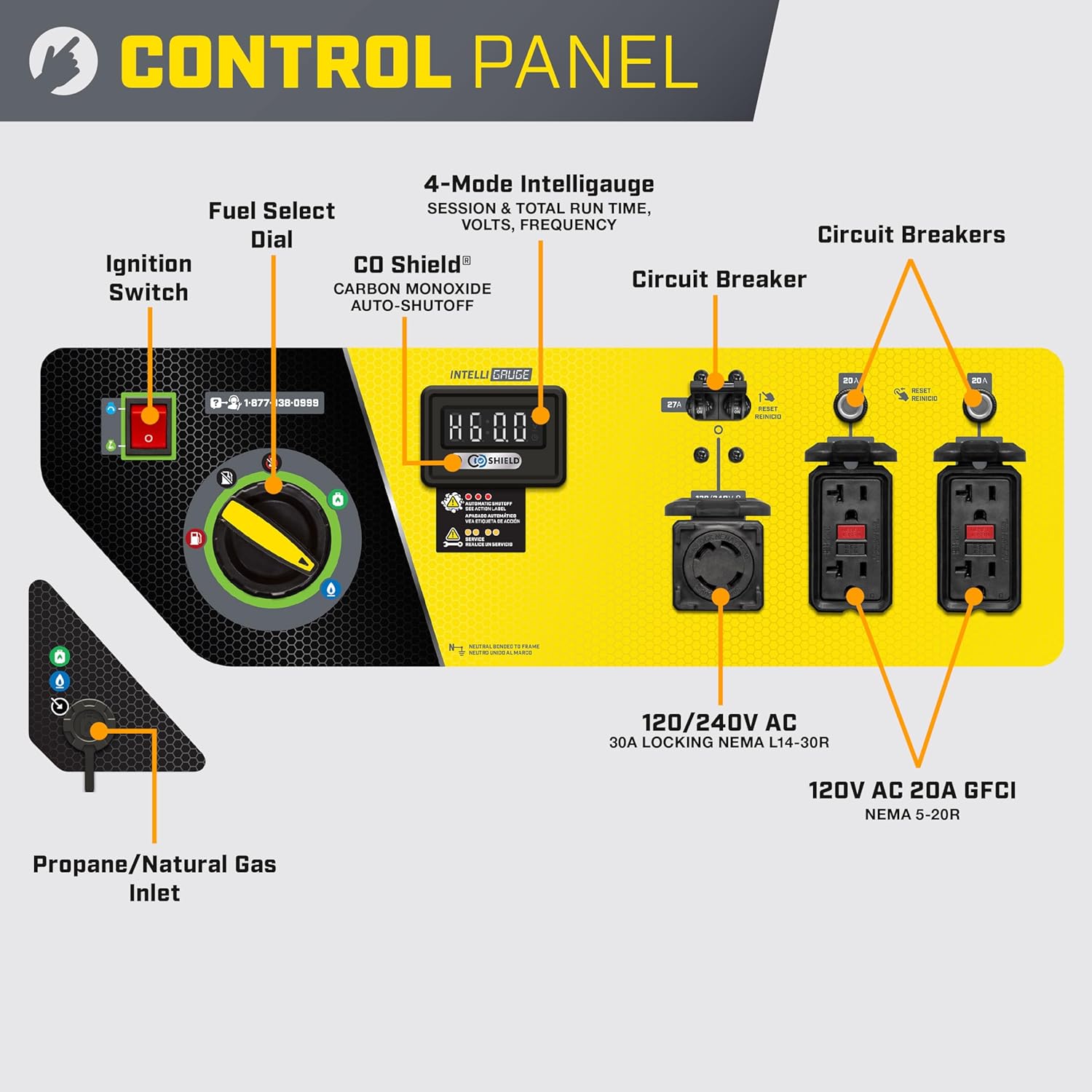 Observe voltage, frequency, session run time, and whole run time to observe output and monitor upkeep intervals, plus options CO Defend carbon monoxide auto shutoff system