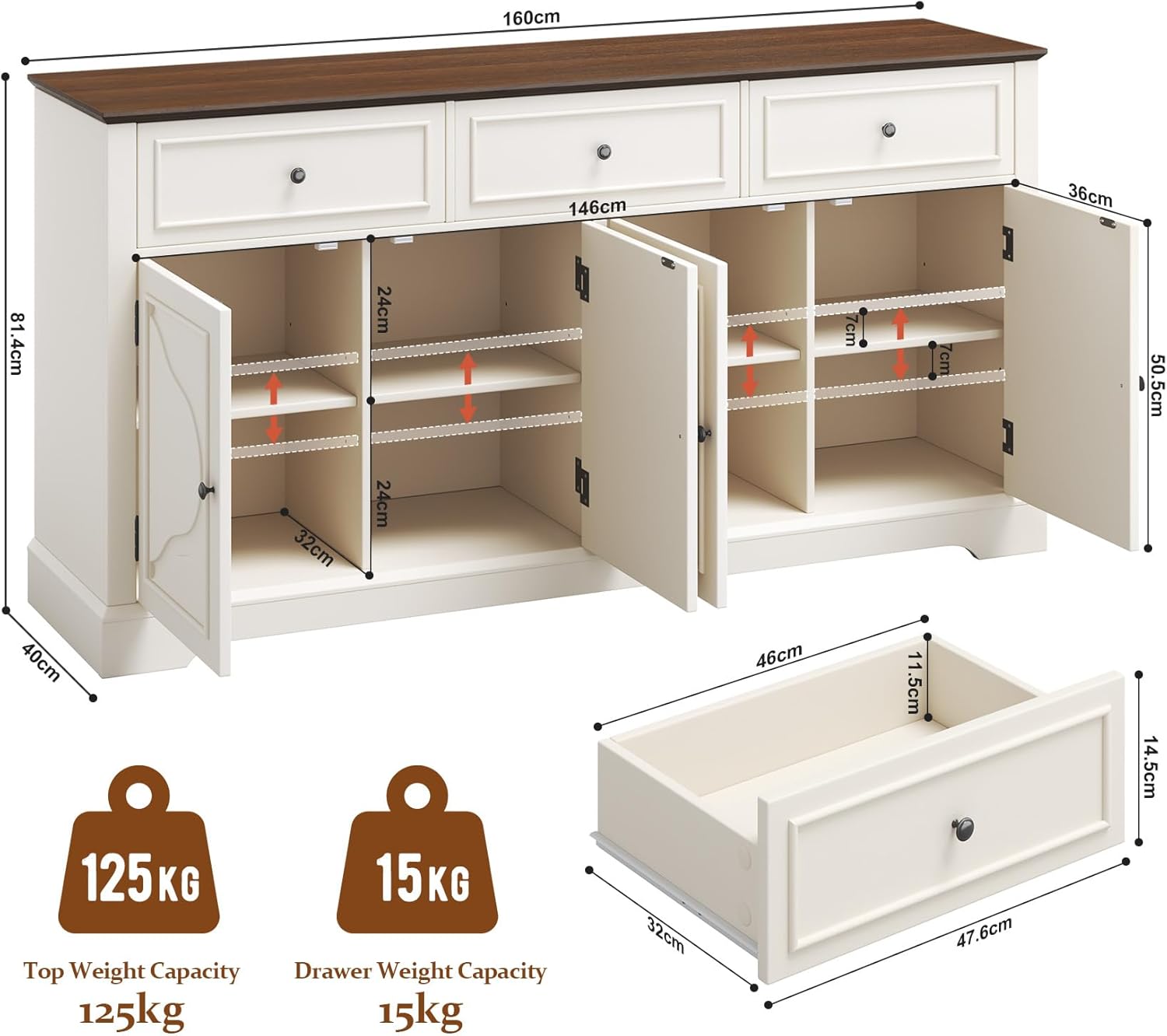 【Sturdy Construction】Constructed from high-quality MDF and easy steel rails, this farmhouse sideboard buffet cupboard includes a scratch-resistant floor for long-term use. An anti-tip {hardware} on the again, together with a strong base, ensures security and prevents accidents. The desktop can bear 176LBS and the drawer can bear 22LBS.