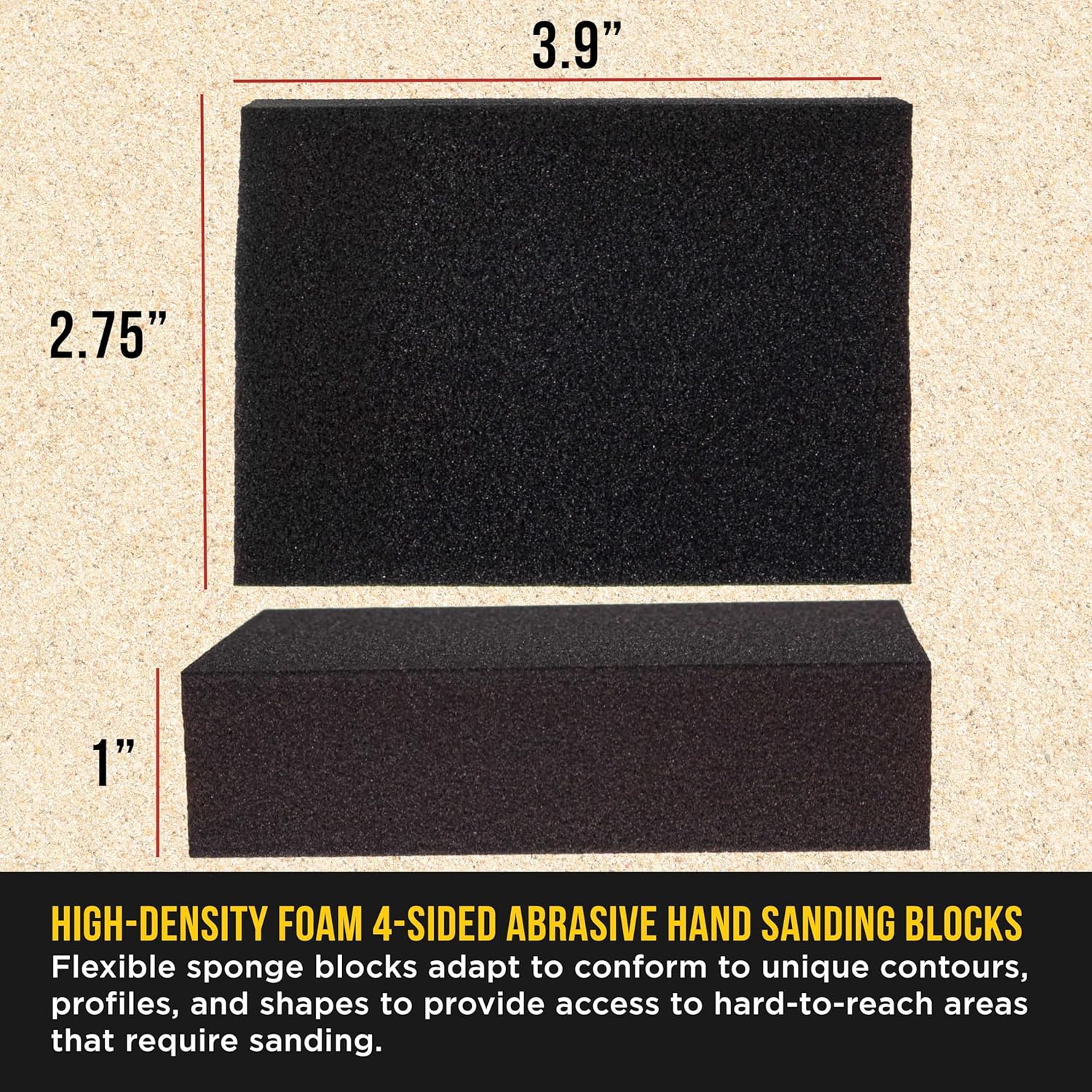 Field of 6 Dura-Gold Efficiency Flex 100-Grit 4-Sided Sanding Block Sponges which can be 3.9″ Lengthy x 2.75″ Huge x 1″ Thick. Excessive-performance, versatile, high-density foam hand sanding blocks with abrasive on all 4 sides. These 100-grit coarse-cut abrasive sanding block sponges are perfect for aggressive sanding on all kinds of surfaces. The extremely versatile sponge pads adapt to adapt to distinctive contours, profiles, and shapes to supply entry to tight, hard-to-reach areas that require sanding.