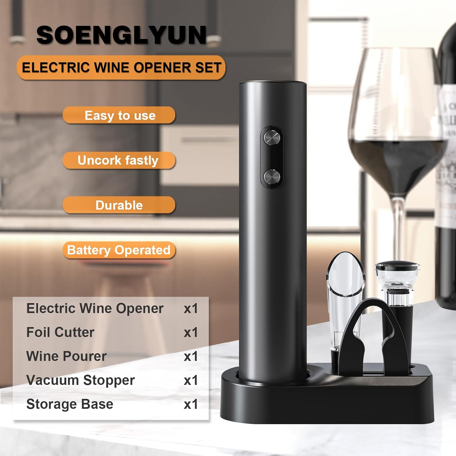 Electrical Wine Opener Set: 5 in 1 set with automated electrical wine bottle opener, foil cutter, vacuum stopper, wine pourer and storage base for all parts