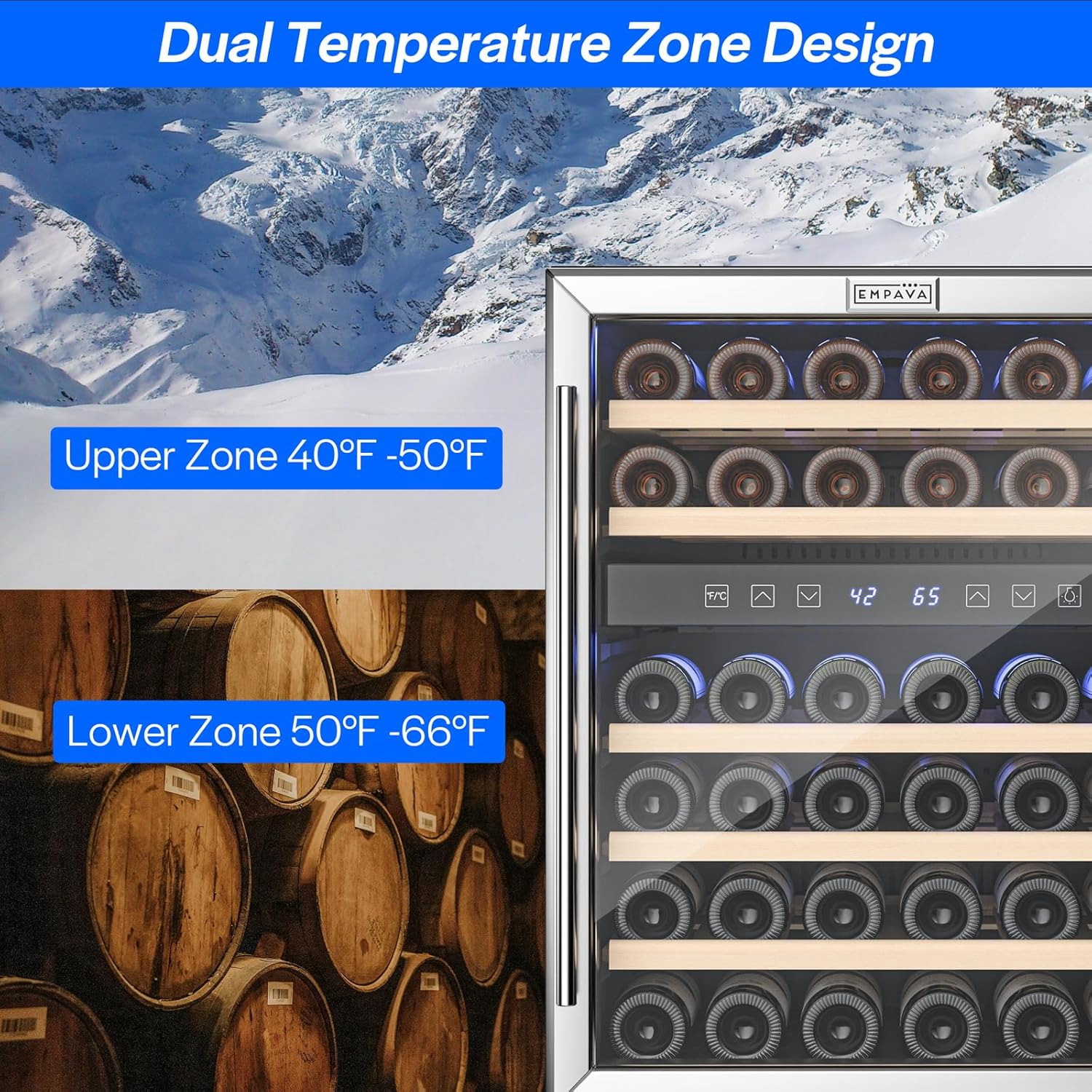 Empava wine cooler ensures optimum storage with a dual-zone temperature management (40°F-50°F higher, 50°F-66°F decrease) , powrful compresser and convection followers for even cooling.