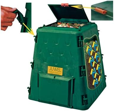 AeroQuick 77 gal. – Small composter with “locking” lid and two doorways to take away compost. Good dimension for a 1-2 particular person home maintain with a small yard. Constituted of 5 mm thick heavy-duty plastic to final 10-15 years; robust sufficient to face on (50% heavier than different comparable dimension compost bins). Open backside permits microorganisms in soil to hurry composting. Dimension: 28.4″ W x 28.4″ L x 31.5″ H; Made in Austria.