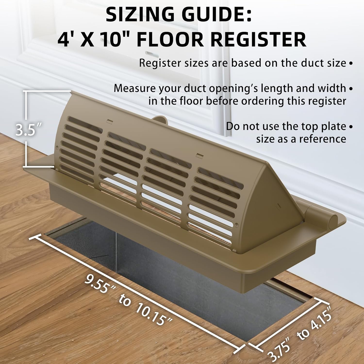 In case your vent size is between 9.55″ and 10.15″ and the width is between 3.75″ and 4.15″, you possibly can select the 4″ x 10″ register vent