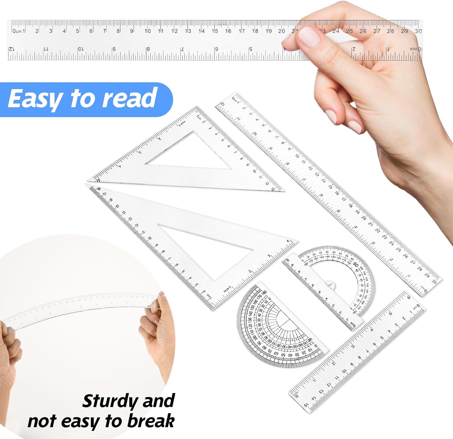 Full Math Device Set: You’ll get 6 items of ruler set, together with 6inch/15cm and 12inch/30 cm straight ruler, 2 items triangle rulers (30/60 and 45/90 levels) and a pair of protractors. The whole mixture meets the wants of varied events