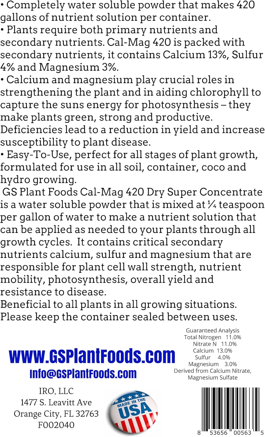 Vegetation require each main vitamins and secondary vitamins. Cal-Magazine 420 is filled with secondary vitamins, it accommodates Calcium 13%, Sulfur 4% and Magnesium 3%.
