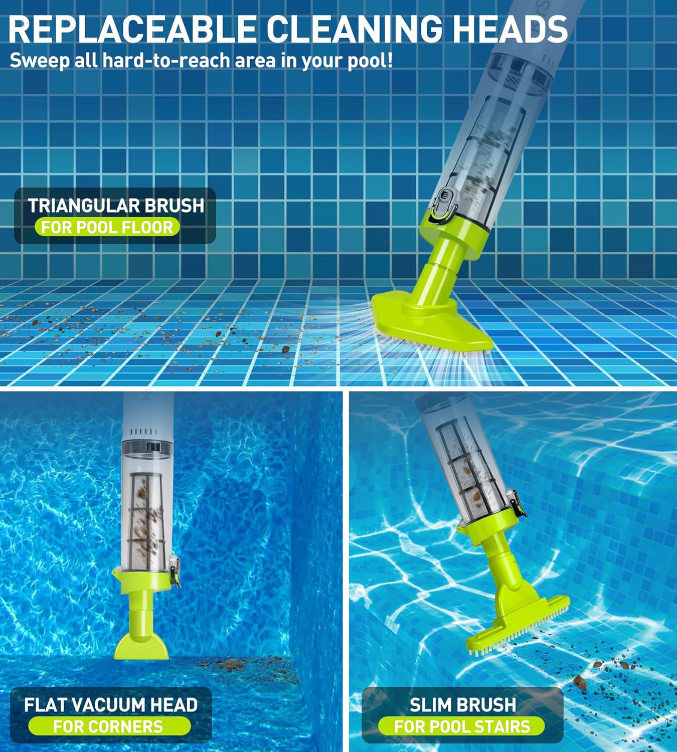 Considerate Design: This handheld pool vacuum is transportable and cordless, permitting you to maneuver freely whereas cleansing. It contains a telescopic pole design, which makes it simple to regulate the size, with a most attain of 65 inches. With the included totally different detachable brush heads, you possibly can attain each nook and shortly clear stains from numerous varieties of onerous to succeed in elements like the steps, pool partitions, or irregular formed swimming pools, making certain an all-round clear.