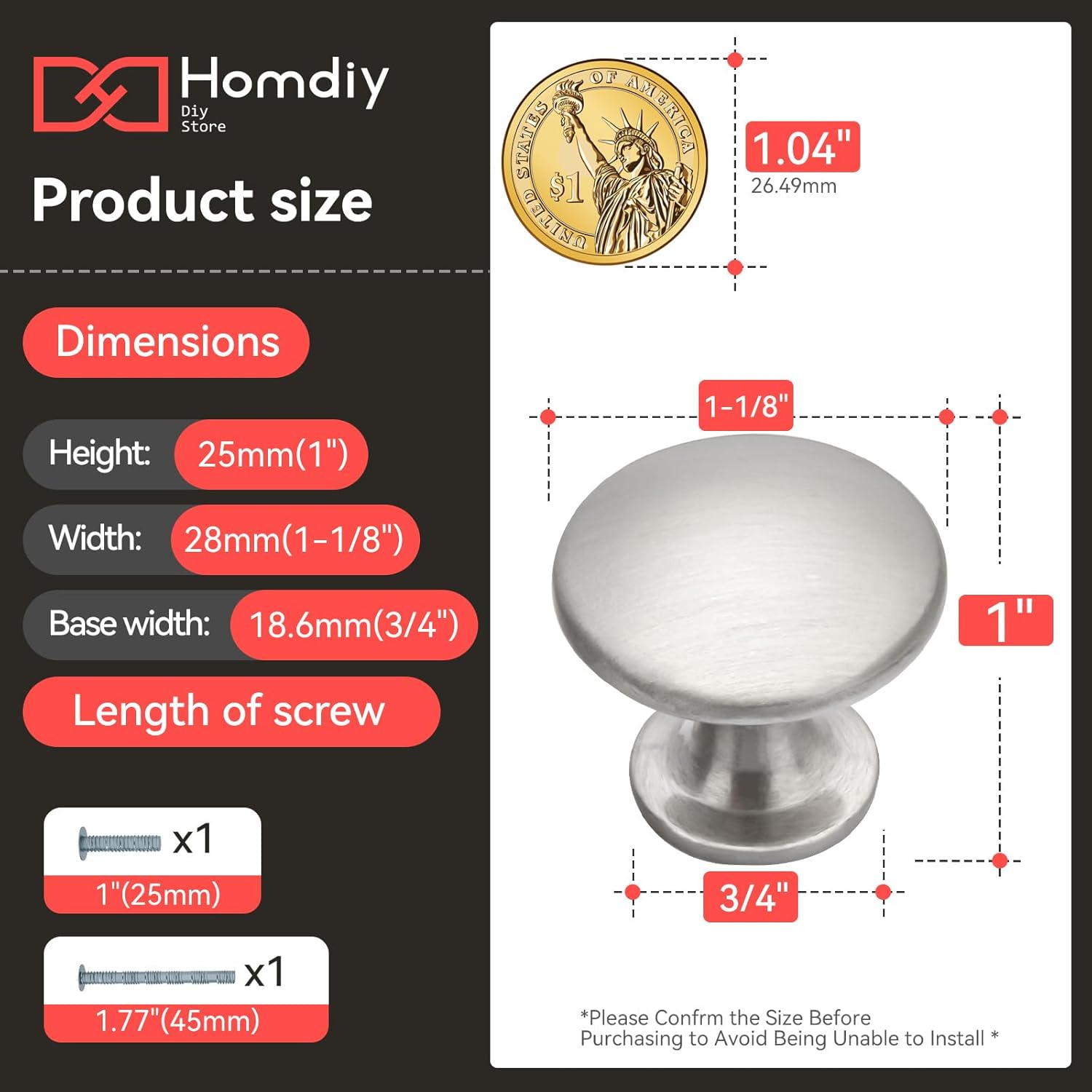 LENGTH & HEIGHT: 1-1/10 inch (Spherical) – Top: 1 inch