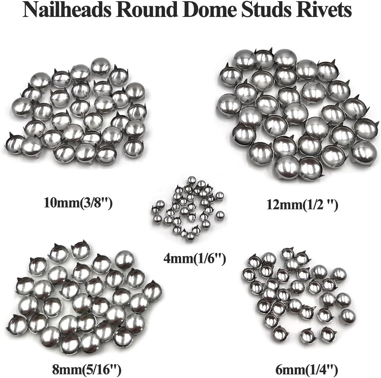 Pack of 150pcs Silver Spherical Dome Studs Leathercraft DIY Nailhead Rivet which have 4 Prongs packed in a fragile and clear field, 5 Measurement Assorted Package, every dimension 30pcs. Diameter: 4mm(1/6″),6mm(1/4″),8mm(5/16″),10mm(3/8″),12mm(1/2 “)