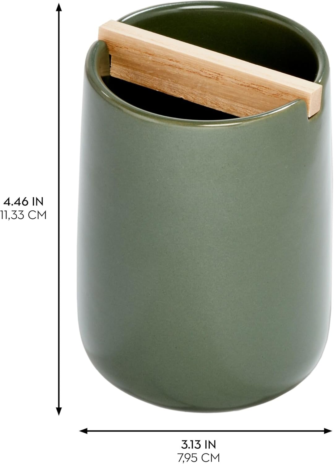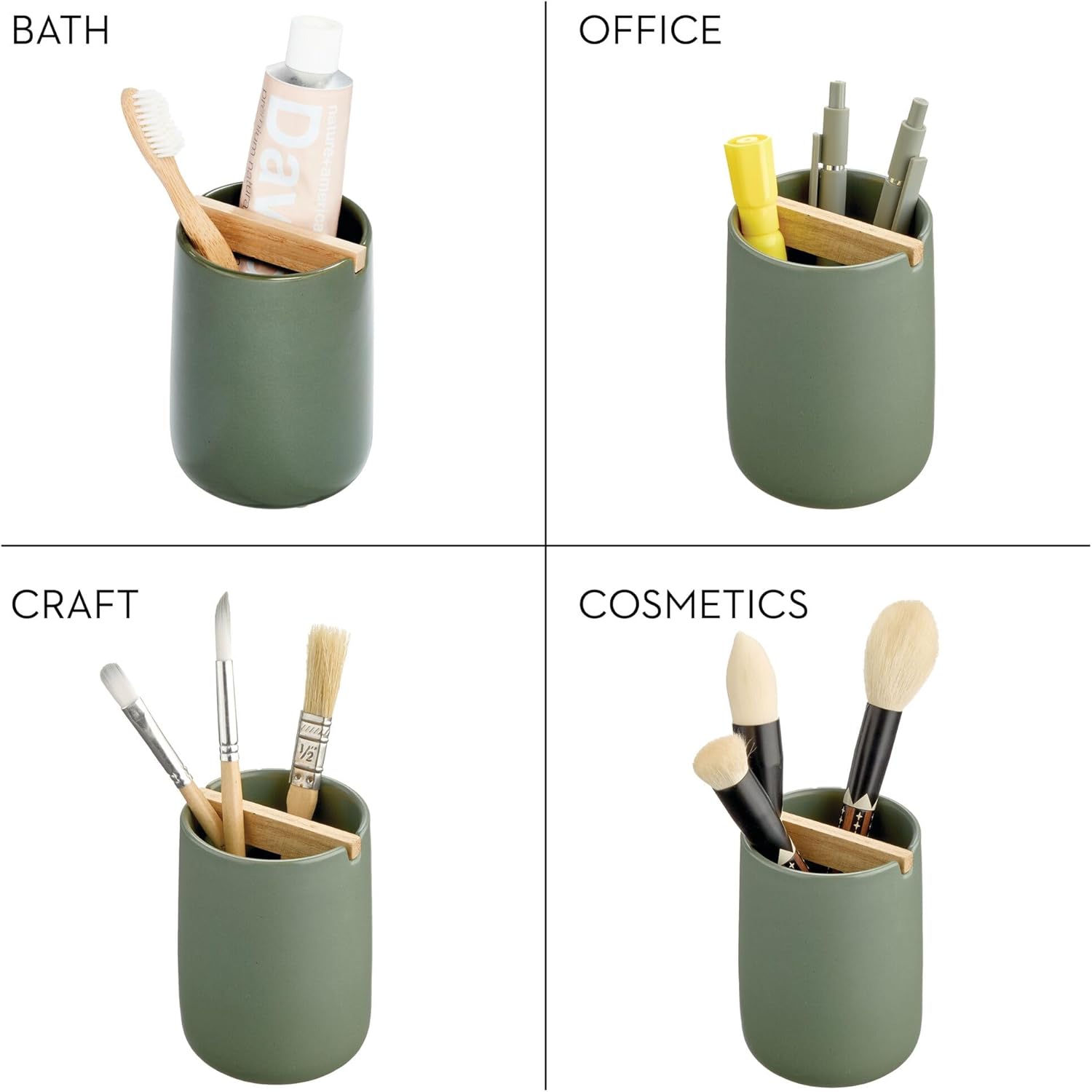 Circularity meets storage with the iDesign Ceramic Toothbrush Holder. This responisbly designed toothbrush organizer is designed with two divided sections to maintain toothbrushes and toothpaste inside attain by the sink. The open high design permits moist toothbrushes to dry extra effectively after use whereas additionally conserving them simply accessible. The non-skid foam ft on the underside of the container hold it in place and stop it from sliding on moist surfaces. This versatile countertop organizer can be utilized to retailer make-up brushes, cosmetics, razors, and extra as properly. It may also be paired with different objects within the Ceramic Earth Assortment for an effortlessly coordinated and arranged lavatory. The trendy design with moss inexperienced and pure wooden finishes matches quite a lot of decor kinds, whereas the sturdy ceramic cup with renewable Paulownia wooden divider stands as much as on daily basis use and is simple to wash. This toothbrush holder measures 3.13″ x 3.13″ x 4.46″ to suit completely in compact areas on counter tops. iDesign is investing in the way forward for our planet. We’re working in direction of using post-consumer recycled plastic for our plastic merchandise and incorporating renewable supplies. With iDesign, you may dwell merely & sustainably on daily basis. Packaging could differ as we reimagine extra sustainable residence group.