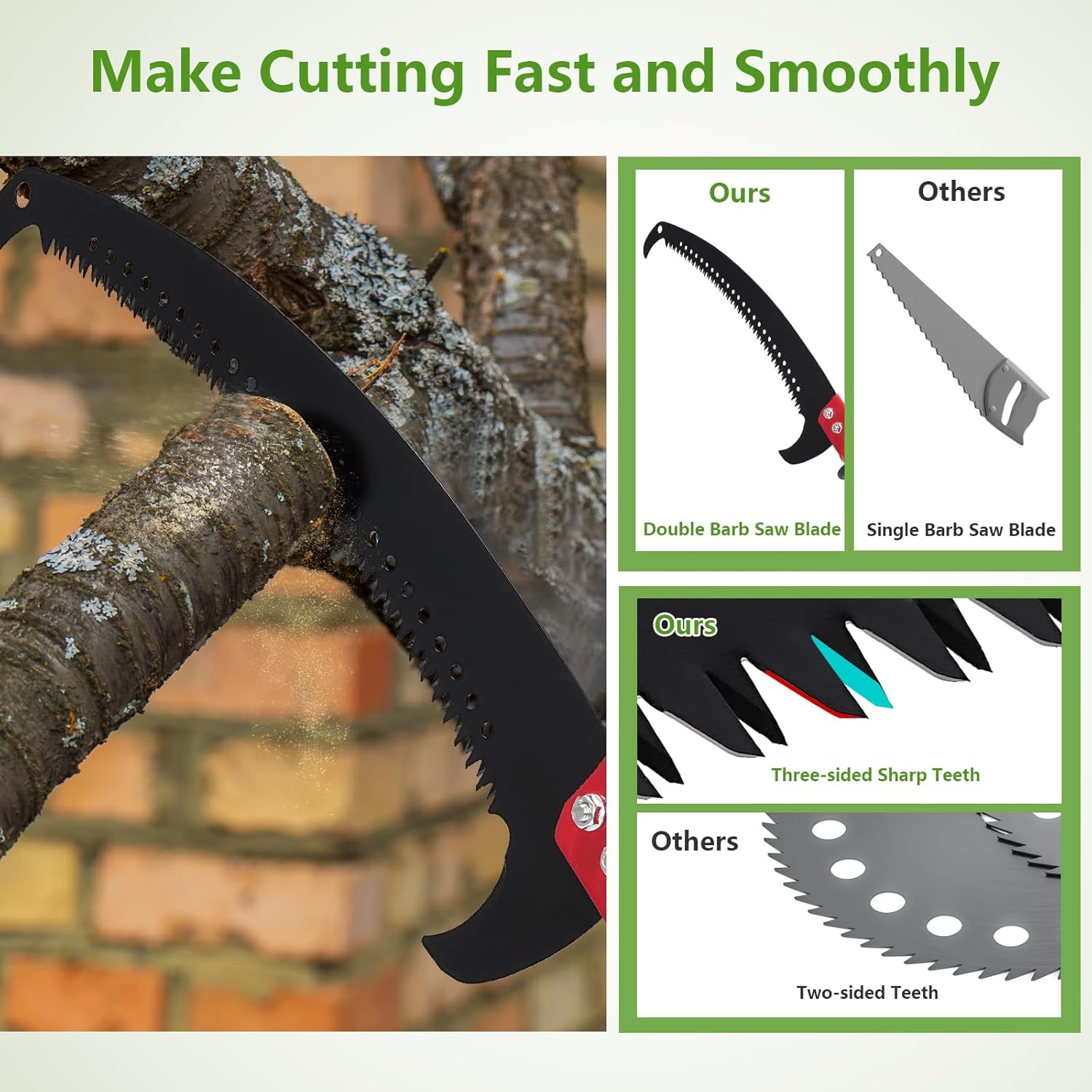 【Twin System】The tree trimmer is provided with two methods, spring-loaded pruning , that are very appropriate for chopping smaller branches. Excessive-strength alloy metal noticed , three-sided grinding enamel are sharper and cuts extra easily, which could be very appropriate for sawing thicker branches. The highest of the blade is provided with a hook knife to take away branches when pulled again, and the underside is provided with a hook knife to take away caught branches throughout chopping and pruning to make sure effectivity. As well as, the unique noticed blade is added with a Teflon coating to make sure extra sturdiness.