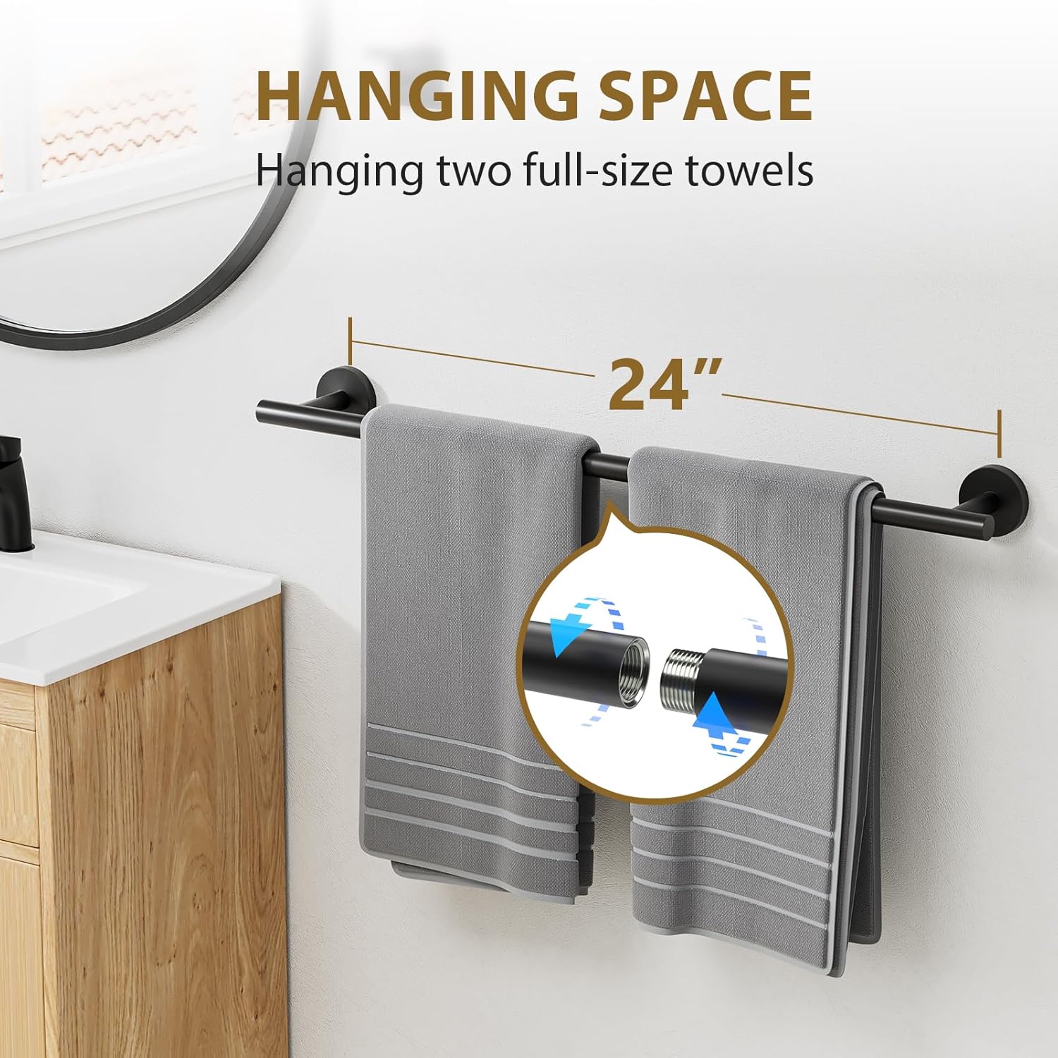 【Lavatory Towel Holder Set】 This versatile lavatory {hardware} set thoughtfully consists of 4 important equipment: a 24 inch towel bar (appropriate with 24 inch wall studs), a bathroom paper holder, a towel ring, and a gown hook, permitting you to effortlessly improve your lavatory for comfort and luxury.
