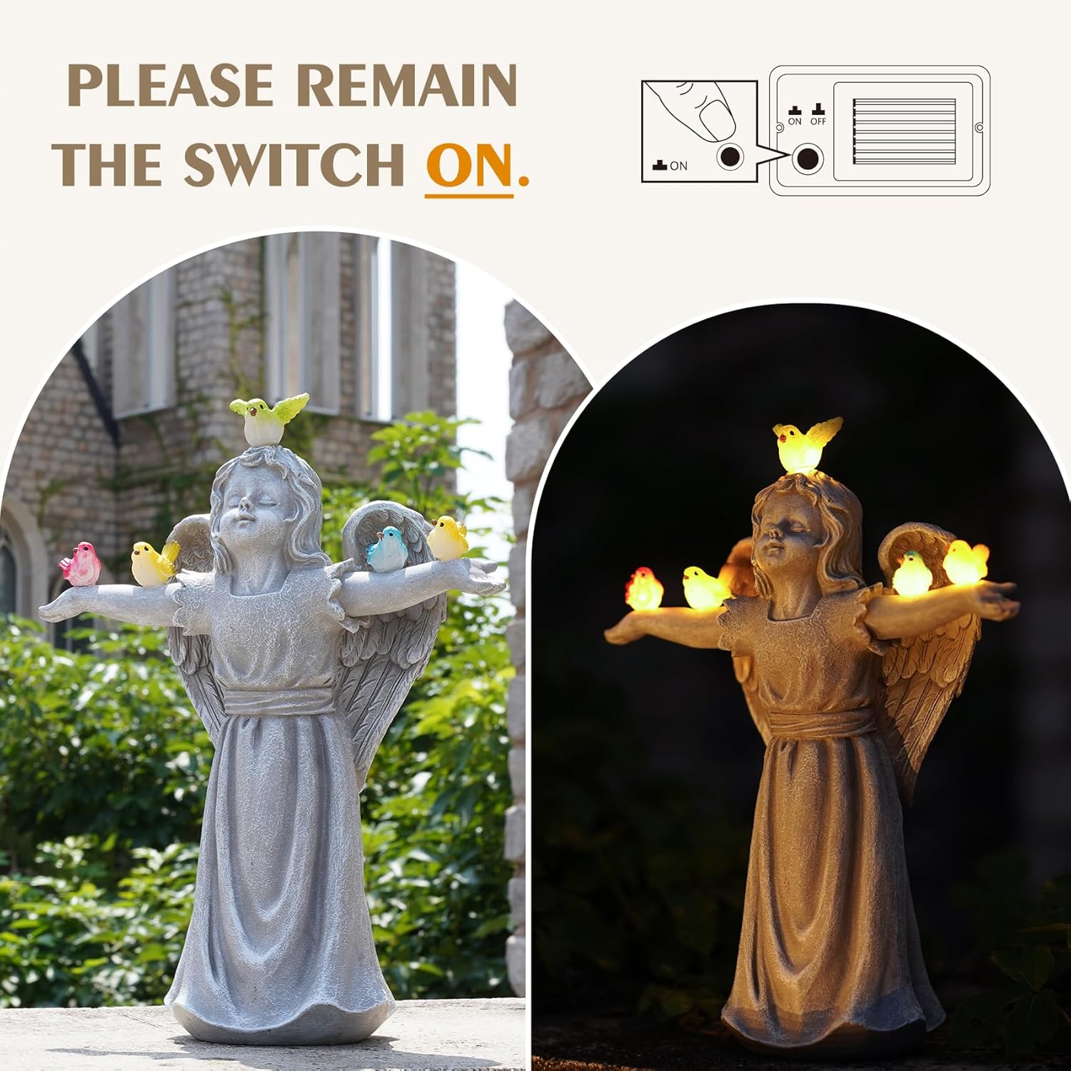 Computerized Photo voltaic Charging: Activate the change and place the photo voltaic statue in daylight for 6-8 hours of charging earlier than utilizing. It would mild up robotically at night time for 8-10 hours. The sunshine is robotically photosensitive.