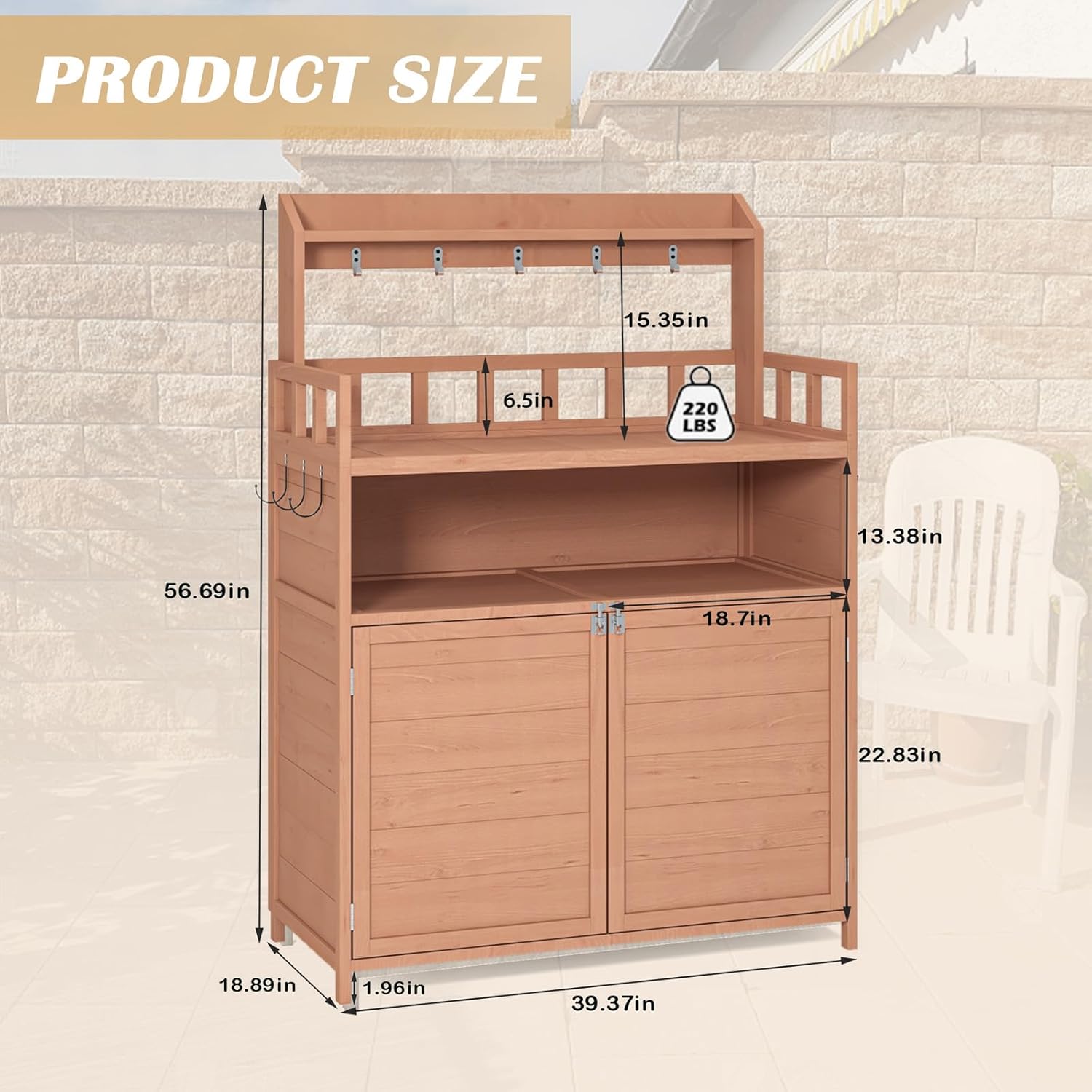 Beneficiant Storage Area :The potting bench boasts a 39.37in×18.9in×12.2in storage unit and a 39.37in×18.9in×22.8in cupboard that may maintain as much as 100kg/220lbs. This considerable storage means that you can neatly set up fertilizers, soil baggage, backyard instruments and different gardening provides.