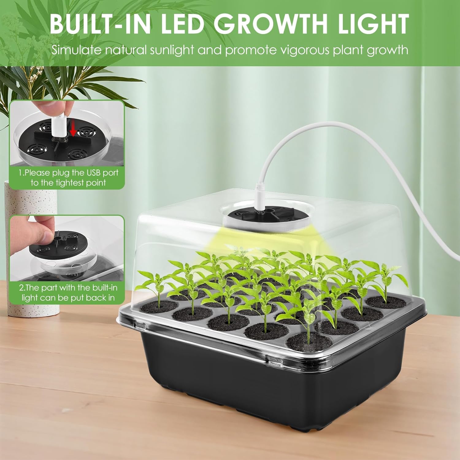 BUILT-IN LED GROWTH LIGHT-The seed starter tray is supplied with LED development lights to simulate pure daylight and promote vigorous plant development; You’ll be able to develop contemporary mint leaves, tomatoes or stunning flowers at house