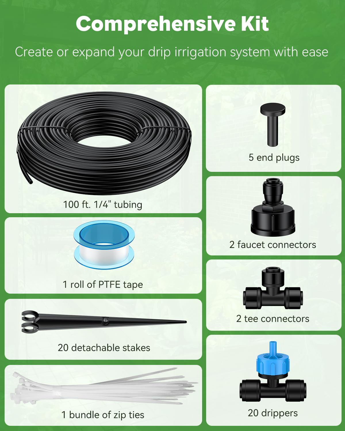 Full 100ft Drip Irrigation Equipment: Embrace 100 ft of 1/4″ tubing, 20 drippers, 20 removable stakes, 2 tee connectors, 5 finish plugs, 2 faucet connectors, 1 bundle of zip ties, and 1 roll of PTFE tape. Expandable system covers 50 sq.ft gardens or greenhouse setups – saves 65% extra water than conventional sprinklers!