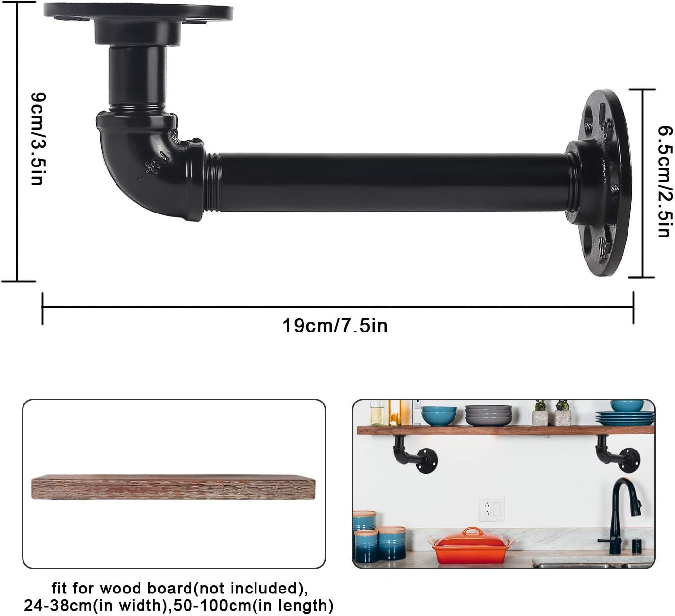 6 packs industrial Pipe shelf brackets are manufactured from malleable iron metal, painted black, can assist 25KG with two cabinets brackets. Combine the economic pipes look together with your trendy decor, Purchased as a pack can even enable you to save extra, these brackets can mount 3 classic floating shelf ornament.