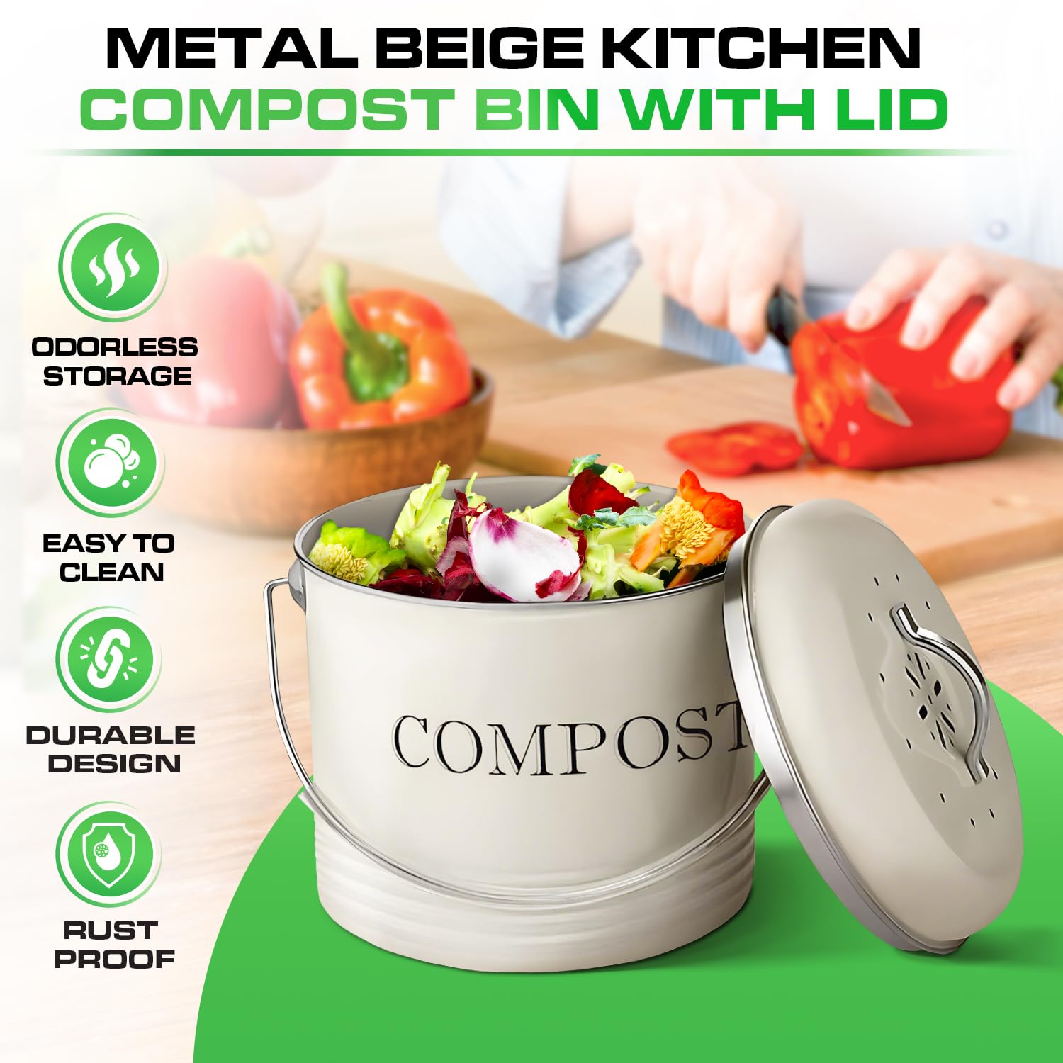 Match for Any Design – Indoor compost bin with impartial beige metallic end enhances varied kitchen decors, provides a contact of class to your composting, merging performance with aesthetic enchantment.