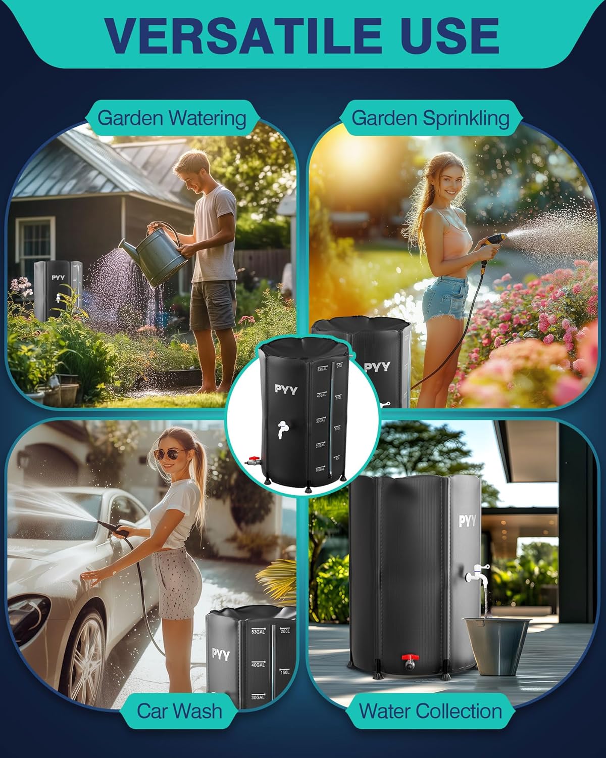 PYY Rain Water Collection Barrel – 53 Gallon Black Water Storage Tank with Spigots, Hose and Portable Bucket, Large Plastic Collapsible Rain Catcher Catchment System to Collect Rainwater from Gutter