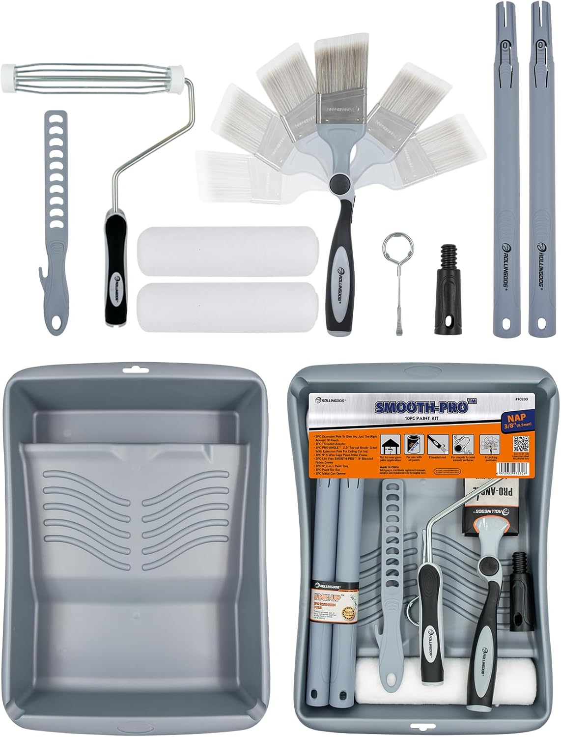 PAINT TOOL KIT:10PC paint rollers for portray partitions room portray equipment contains 1pc paint curler tray,1pc 9″ paint curler body and 2pcs excessive efficiency paint curler cowl refills for big space portray, 1 computer 2.5″chopping in Angular paint brush for exact element portray, 2 pcs segmented extension poles with 1pc adapter for attain of upper locations,1pc paint stir bar, 1pc can opener, all important useful instruments for dwelling portray and ornament
