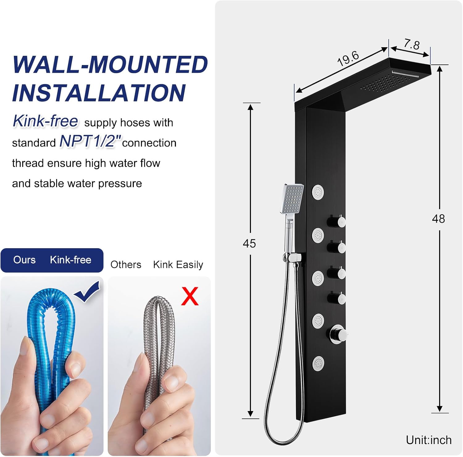 【Multi-Operate Bathe Panel】This 4-in-1 elegant bathe panel in trendy black is an eye-catcher in each lavatory. With a rainfall and waterfall overhead bathe, 3-function hand bathe and 5 physique therapeutic massage jets, the bathe panel supplies an unforgettable bathe expertise to chill out and really feel good. All capabilities can work independently and 4-mode bathe additionally will be turned on on the similar time