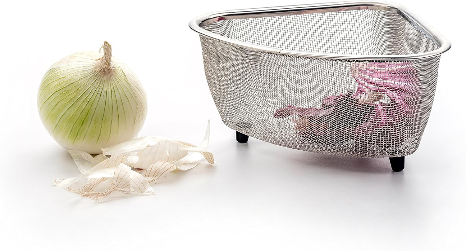 RSVP International Endurance® In-Sink Mesh Colander Strainer Basket, 3 Quart | Organize Sponges, Collect Food Scraps | Dishwasher Safe | Small Corner Basket | Steaming, Draining & Rinsing