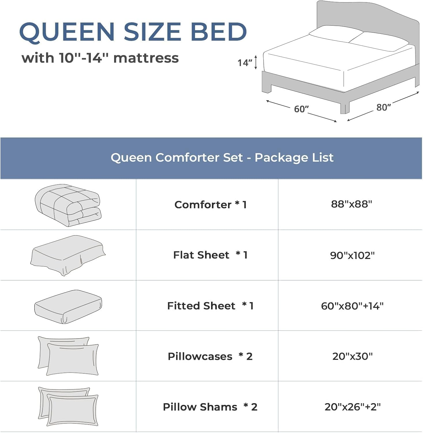 Mattress in a Bag Queen: Consists of 1 comforter (88″x88″), 1 flat sheet (90″x102″), 1 fitted sheet (60″x80″+14″), 2 pillowcases (20″x30″), and a couple of pillow shams (20″x26″+2″) to finish your mattress in a single step. For a extra embracing really feel, chances are you’ll go for a measurement bigger