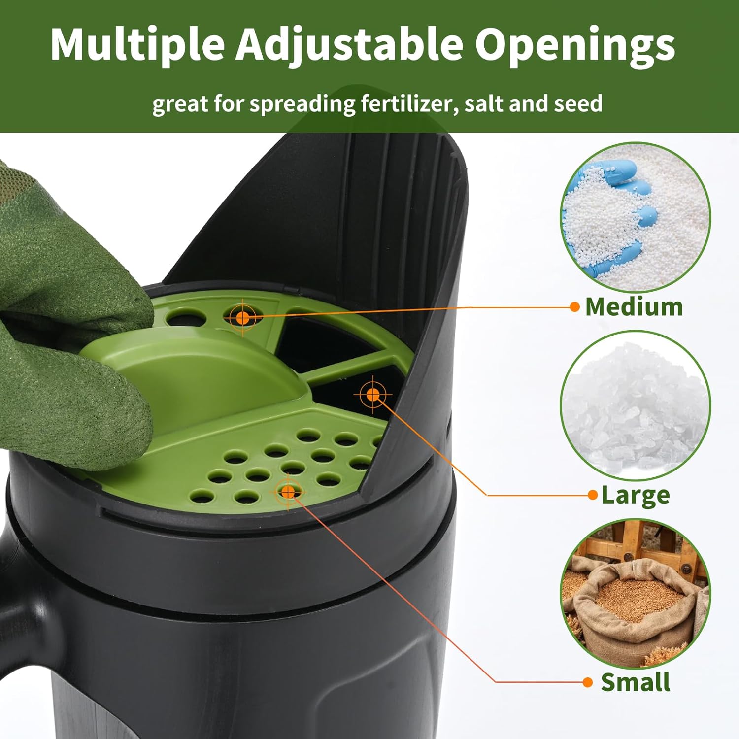 Adjustable Openings : The grass seed spreader comes with backyard gloves and adjustable openings in 3 totally different sizes for spreading totally different supplies from coarse to fantastic.