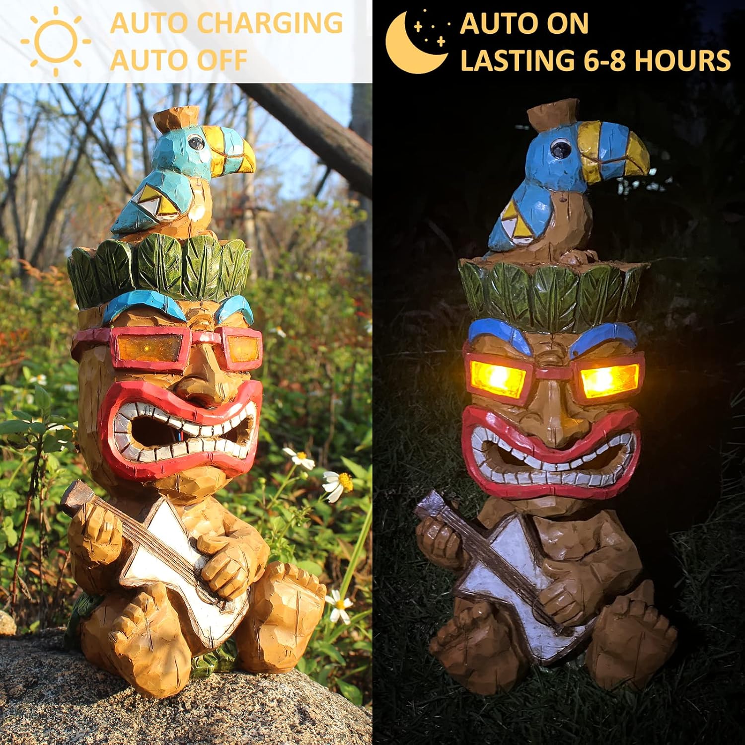 【BRIGHT EYES 】This tiki statue is taking part in with a guitar ,eye that emits a heat and vibrant glow after the sundown. Place Outside tiki decor beneath full solar to soak up daylight throughout the day with the standard built-in photo voltaic panel. Simply toggle the highest switchand go away it within the ‘on’ place within the daytime. The photo voltaic panel will cost inside 5-8 hours throughout the day and lightweight up mechanically at night time for 8-10 hours